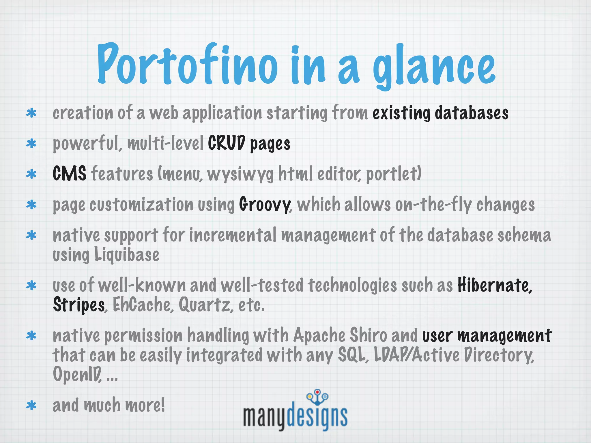 This document provides instructions on how to build a web application using the Portofino web framework. Portofino allows for the creation of web applications from existing databases and includes features like CMS functionality, page customization using Groovy, and native support for database schema management with Liquibase. It utilizes common technologies like Hibernate, Stripes, and EhCache. The document outlines how to start a new project, create pages, manage authorization and permissions with Apache Shiro, and provides notes on customization options. It also lists some organizations that currently use Portofino in their applications.