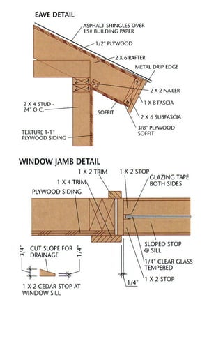 This document provides plans and instructions for building a basic 12' x 8' shed. It includes a list of all necessary materials, diagrams of the framing and roof structure, and step-by-step directions for constructing the floor frame, walls, roof, and exterior finishes. Key details include framing the floor on gravel and skids, installing 2x4 wall studs and headers, cutting rafters and installing the roof ridge board, and finishing with asphalt shingles, plywood siding, and trim details.