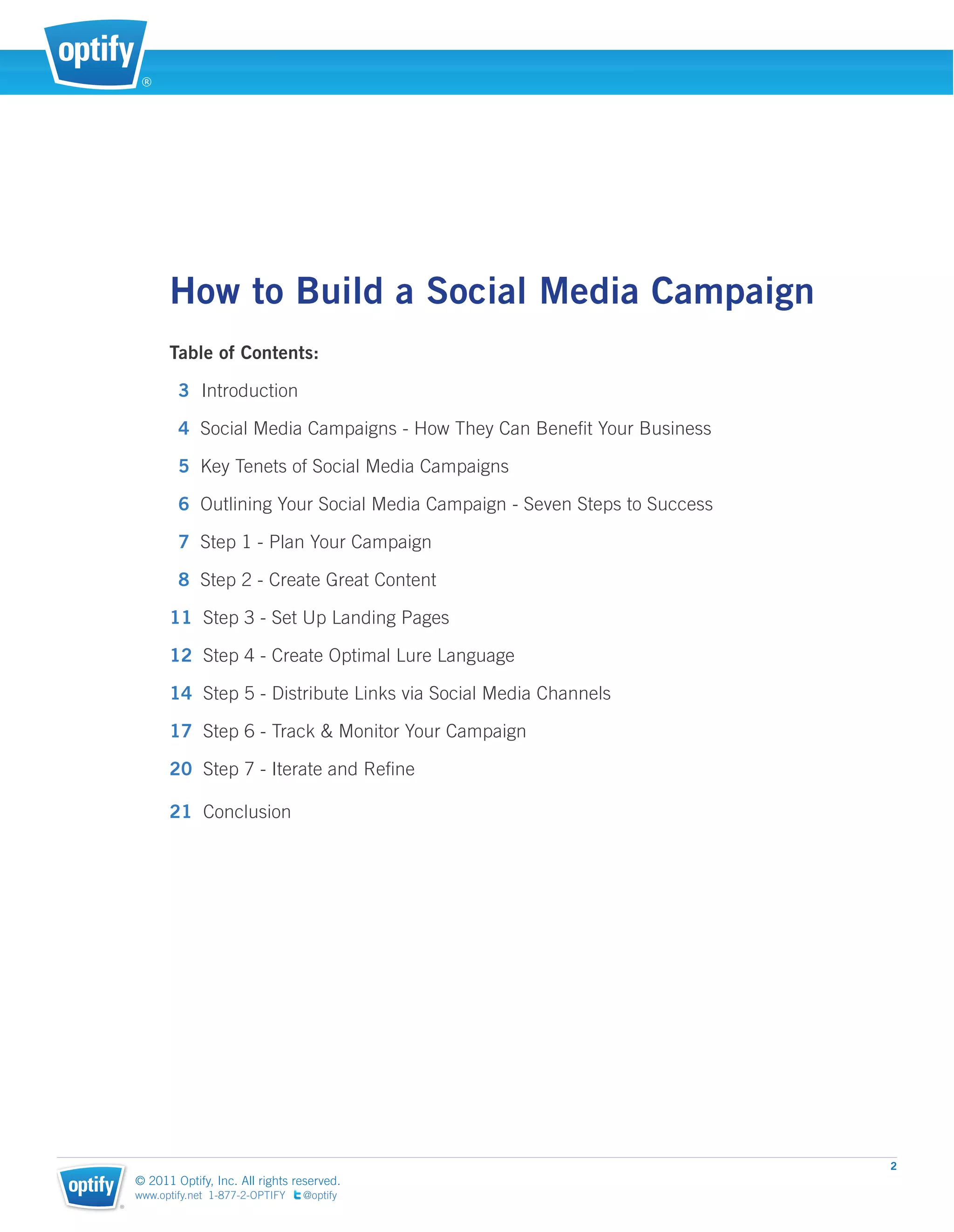 This document provides guidance on building a successful social media marketing campaign. It discusses how social media campaigns can benefit businesses by creating buzz, generating traffic and leads, joining conversations, working with customers, and building reputation. Key tenets are outlined, including monitoring, engaging, and influencing across owned, earned, and paid social media channels. A seven-step process is then described for planning, creating content, setting up landing pages, crafting optimal messages, distributing on social platforms, tracking performance, and refining the campaign.