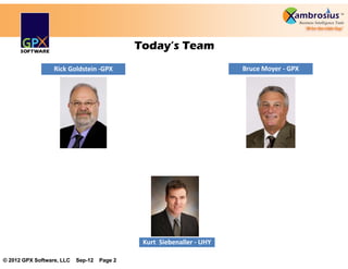 This document provides an overview of pro forma financial planning and analytics for small businesses. It discusses best practices for SMB financial planning, opportunities and pitfalls, and making analytics a value-added process. It also introduces the GPX Software solution called Xambrosius, which automates pro forma creation to reduce spreadsheet programming waste. Xambrosius connects to popular accounting systems and provides pre-programmed industry models, scenario planning, and analytics comparisons to actuals and competitors.