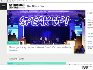 The document outlines the Southbank Centre's initiative to create an open and participatory website aimed at enhancing user experience and transparency through features like open data and user advisory groups. It highlights the importance of user engagement and testing in the development process. The project aims to provide a trusted digital space for arts and learning, emphasizing the transformative power of art.