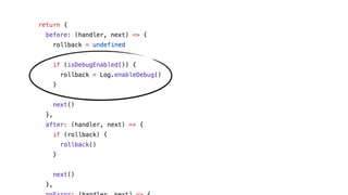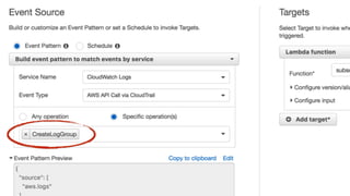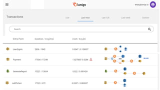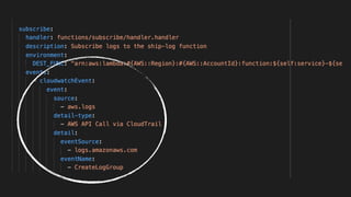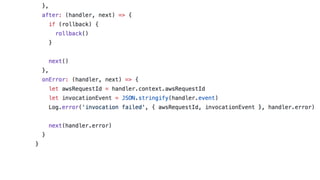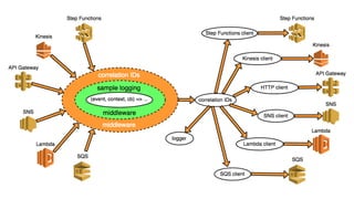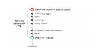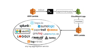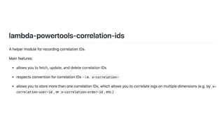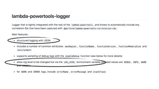 The document discusses the challenges of building observability into serverless applications and some approaches to address these challenges. Specifically, it notes that in serverless environments there is nowhere to install agents, no background processing, high concurrency, and risk of data loss if batching logs and metrics. It then outlines approaches for logging, metrics, and tracing using services like CloudWatch Logs, X-Ray, and propagating correlation IDs across functions.