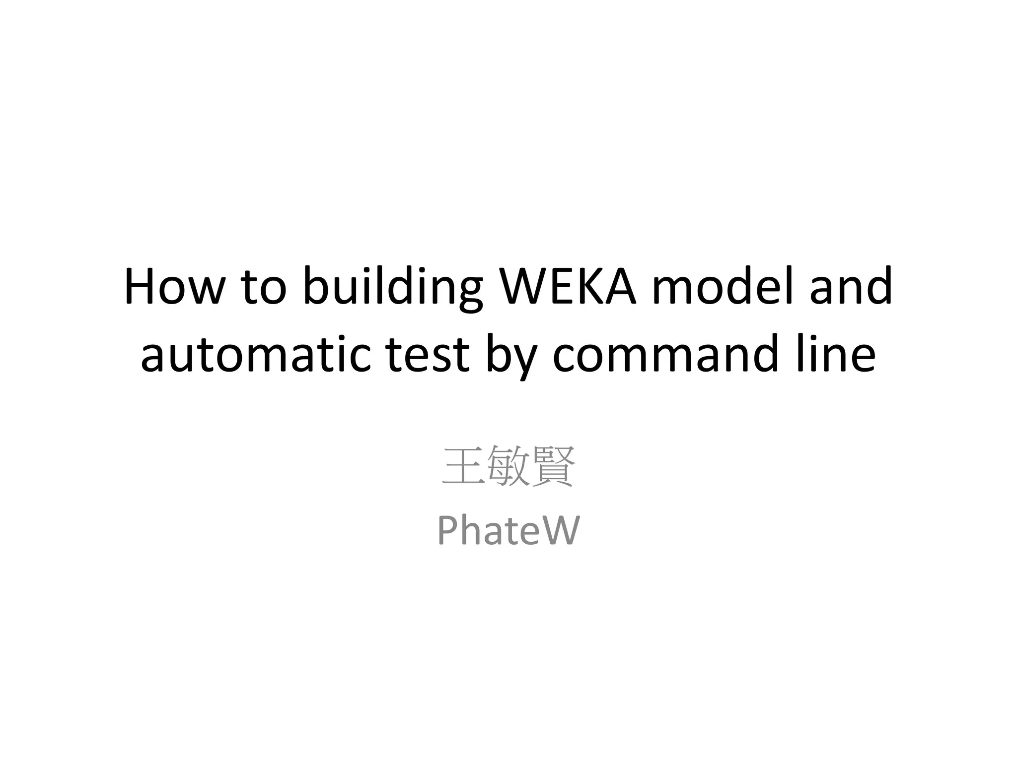 本文档介绍了如何通过命令行构建 Weka 模型和进行自动化测试,适用于批处理操作。讨论了 Java 类路径的设置、Weka 命令行选项、示例命令以及如何使用批处理文件进行自动化测试。提供了详细的步骤和链接以帮助用户有效利用 Weka 工具。