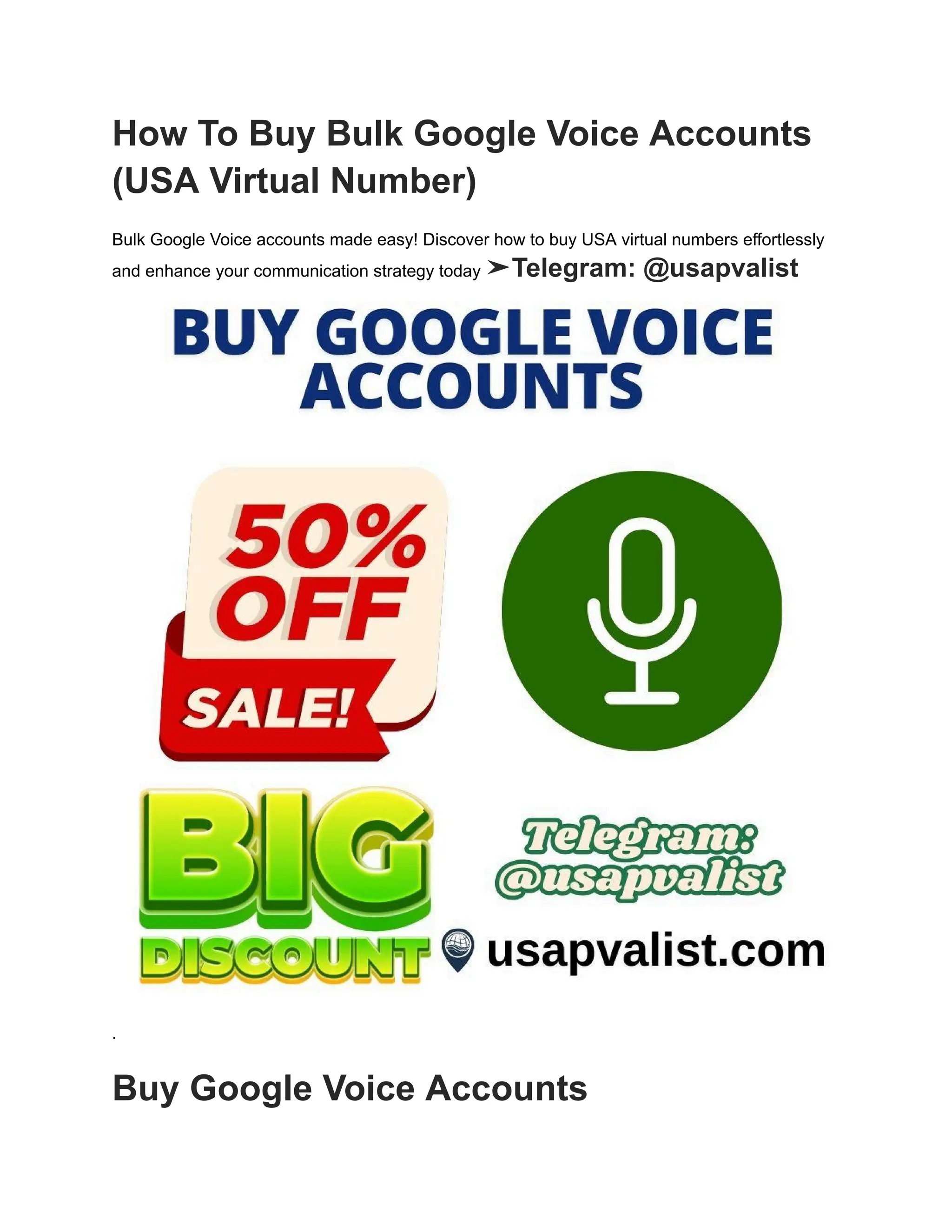 The document provides a comprehensive guide on purchasing and utilizing bulk Google Voice accounts for personal and business communication. It highlights the benefits, features, security measures, and best practices for effectively managing multiple virtual numbers, emphasizing how these accounts enhance connectivity and streamline operations. Furthermore, it addresses common concerns and offers insights into the future of Google Voice as a valuable tool in today's digital communication landscape.