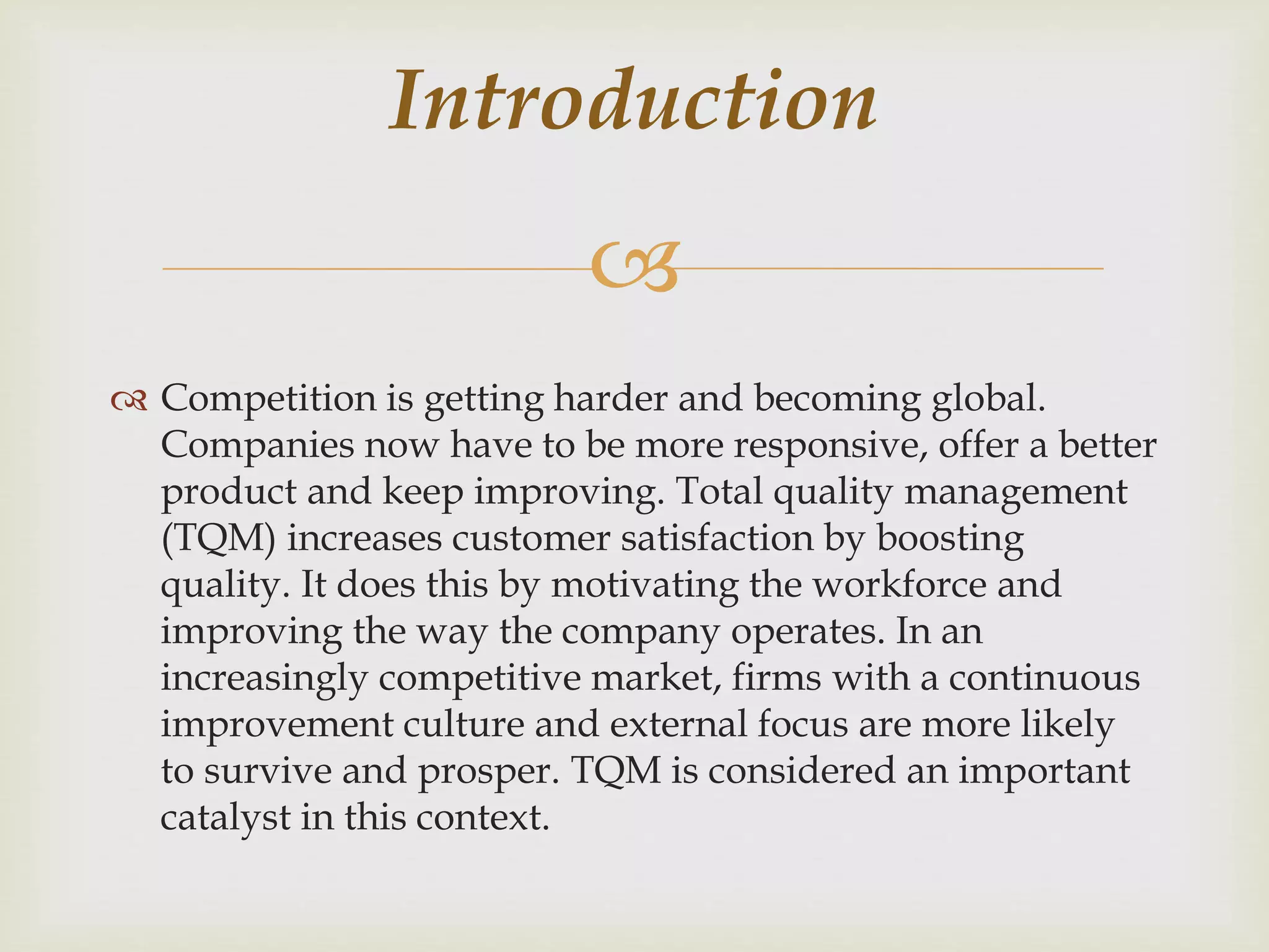 Total quality management (TQM) is an approach to improving business effectiveness and flexibility through organization-wide involvement. It ensures quality is a strategic priority and focuses on prevention over inspection. TQM aims to meet customer requirements, continuously improve quality, and develop open trust among employees. By motivating workers and integrating all functions, TQM enhances innovation and competitive advantage. Key elements include being customer-focused, reducing defects, constant improvement, and teamwork.