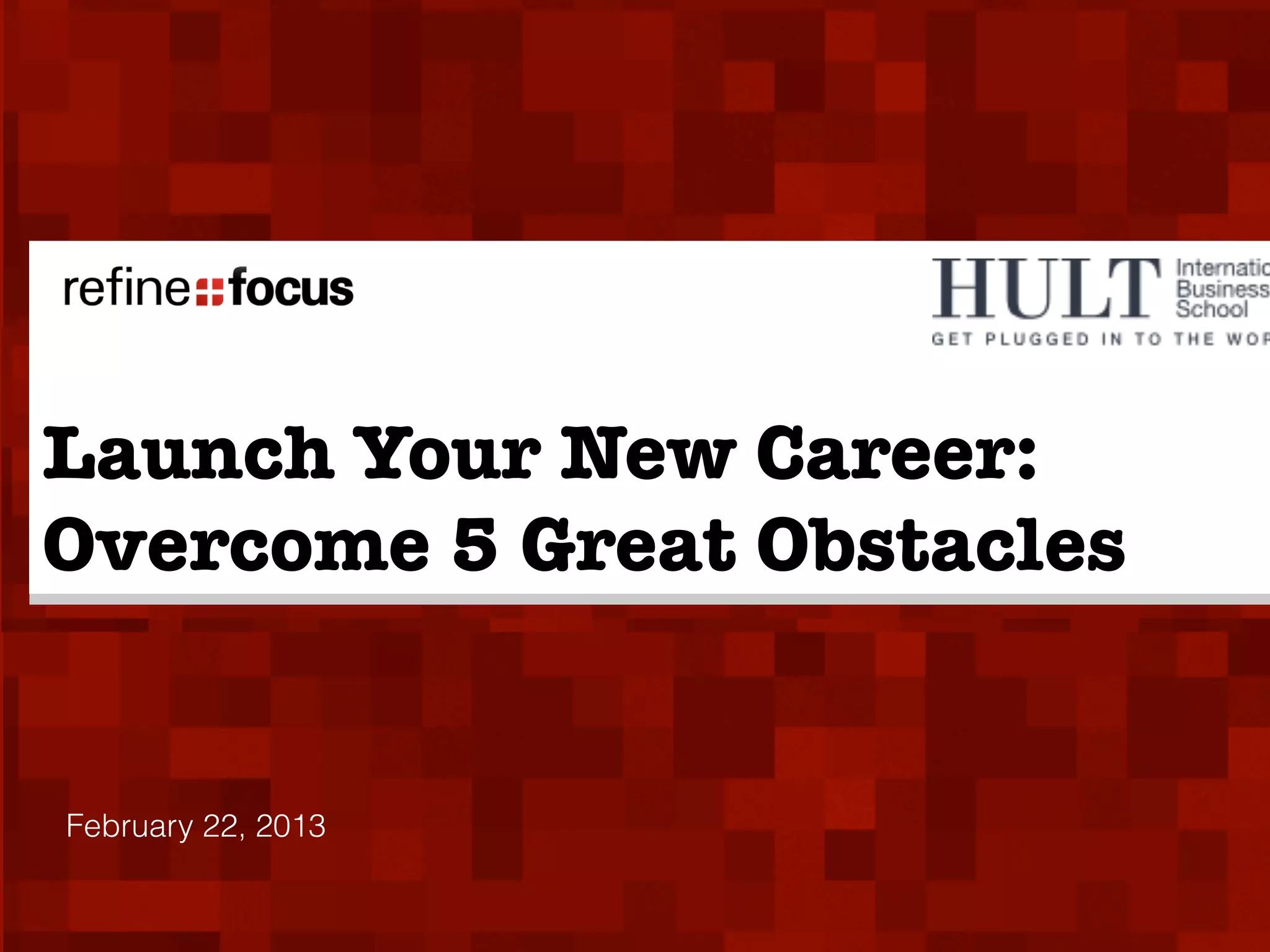 This document outlines 5 great obstacles to overcome when launching a new career in strategy consulting: 1) My Ex, or one's previous career identity, 2) Starting Point, or where to begin, 3) Perfect Fit, or determining the right company/role match, 4) Networking challenges, and 5) competition from New Kids or younger candidates. The author details their own experience overcoming these obstacles to become a consultant, and provides solutions for analyzing oneself as a consultant case and developing new skills to adapt. Readers are invited to discuss their own obstacles and questions.