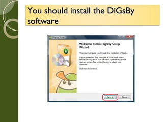 - The document provides instructions for how to chat using DiGsby, including installing the software, creating an account, adding IM, email, and social accounts, setting your status, and sending/receiving instant messages.