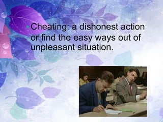 Cheating in exams can take several forms, including bringing unauthorized materials like bottles with formulas written on them, writing on hands or hiding small papers with notes inside hands during multiple choice or formula exams. Some students also cheat using technology like MP3 players, iPods, Bluetooth pens and mobile phones. While cheating may help students pass exams, it is ultimately dishonest and can result in being caught and facing defeat if discovered.