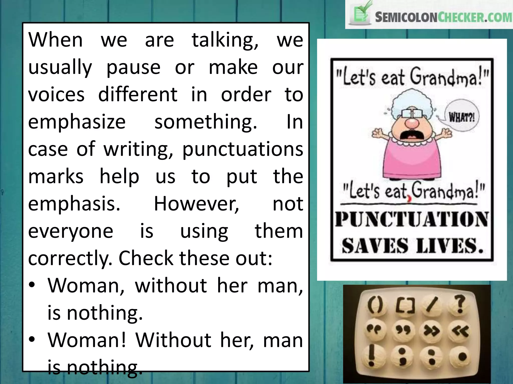 The document provides a detailed guide on punctuation usage, including commas, semicolons, colons, quotation marks, parentheses, and dashes. It illustrates rules with examples, emphasizing their importance in writing for clarity and emphasis. Overall, it serves as a resource for improving grammar and punctuation skills.