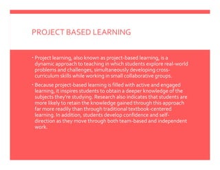 The document discusses project-based learning and how to choose an IEEE project. It explains that project-based learning involves students exploring real-world problems in small collaborative groups to develop cross-curriculum skills. When choosing an IEEE project, students can take their core idea or a part of an idea from an IEEE research paper, though they may not be able to exactly replicate years of research. The document also distinguishes between an IEEE base paper that a project idea is based on, and reference papers that discuss smaller aspects of the project. It provides benefits of choosing a project through TTA, such as free cloud hosting, guidance from experts, software and training support, and assistance with placements.