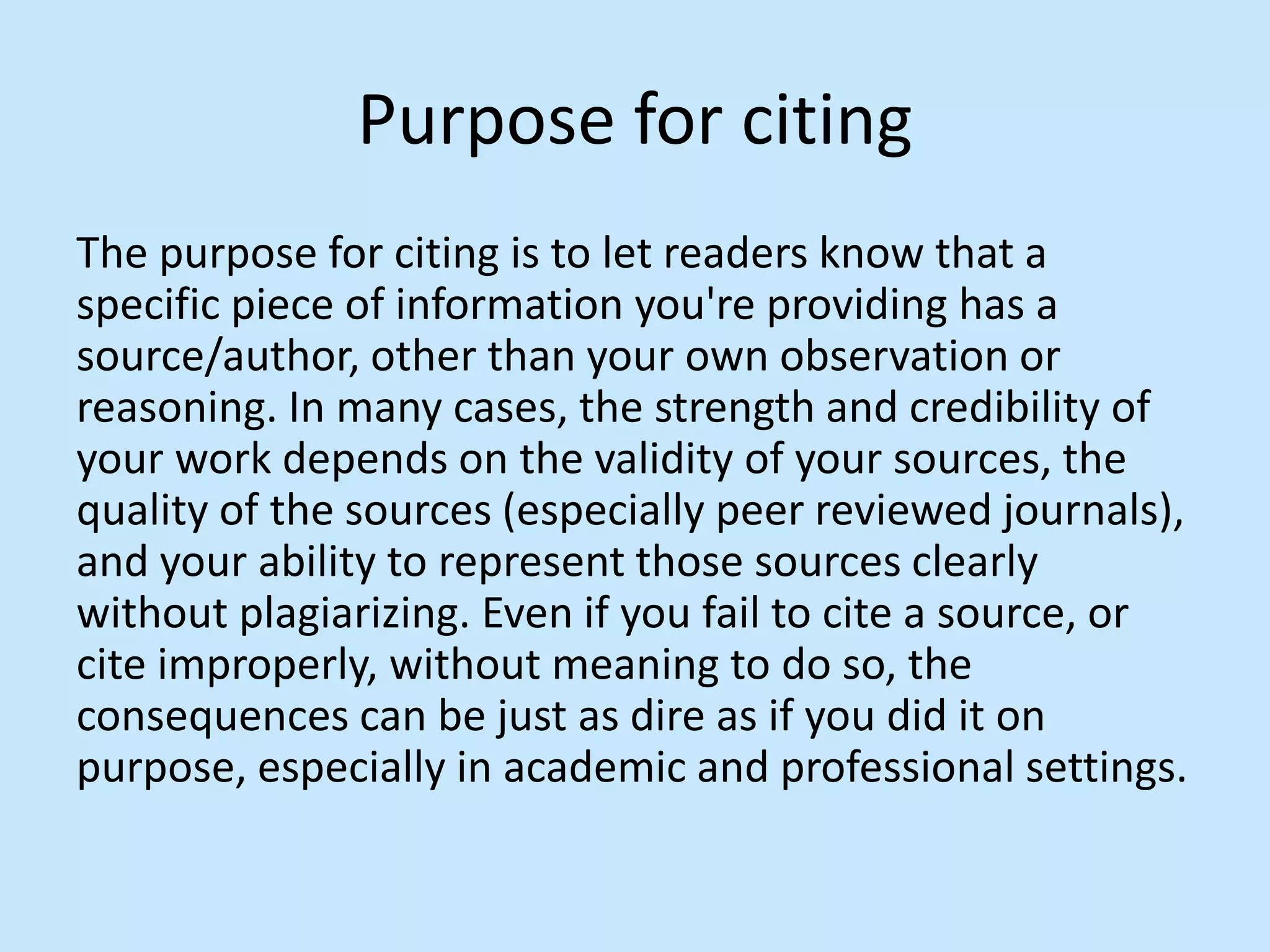 The document outlines the importance of citing sources in academic and professional work to avoid plagiarism and to validate the information presented. It provides detailed guidelines on gathering citation information for different types of sources, including books, articles, and websites, as well as proper formatting for in-text citations and bibliographies. Additionally, it references various citation styles such as MLA, APA, Turabian, and Chicago manual of style.