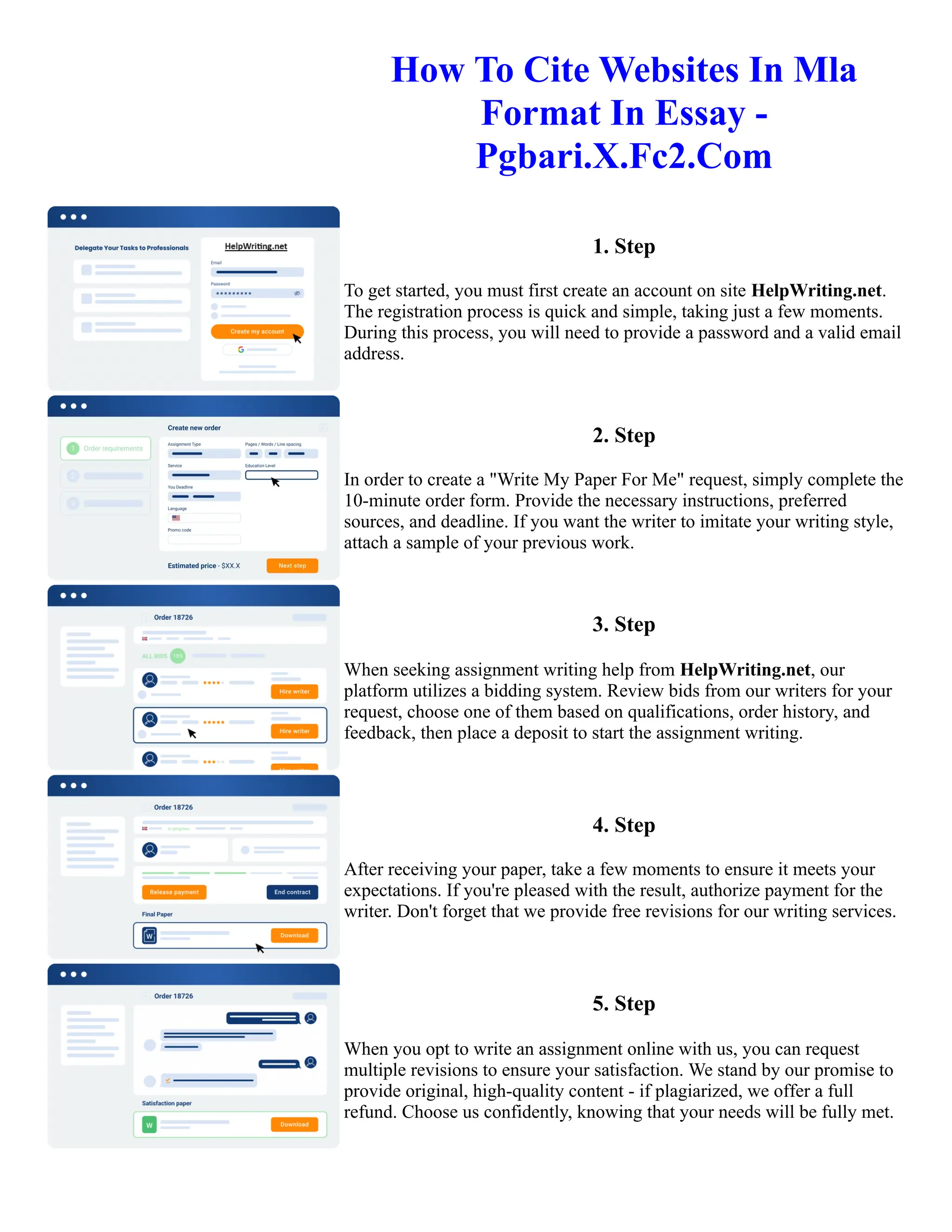 The document provides instructions for creating an account on a website that offers writing assistance services. It outlines a 5-step process: 1) Create an account with a password and email. 2) Complete an order form with instructions, sources, and deadline. 3) Review bids from writers and select one. 4) Review the completed paper and authorize payment. 5) Request revisions until satisfied. The website promises original, high-quality content and refunds for plagiarized work.