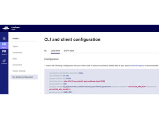 This document discusses how to create a Kafka cluster using Confluent Cloud and run a "hello world" example. It outlines installing the Confluent Cloud CLI, logging in, selecting an existing cluster, creating a Kafka topic, generating an API key, running a Kafka consumer in the background to consume from the topic, and using the Kafka producer to send messages to the topic. This allows one to publish and subscribe to streaming data between a producer and consumer using Confluent Cloud and Apache Kafka.