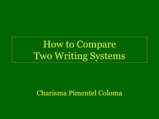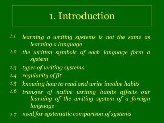 This document outlines a method for systematically comparing two writing systems. It discusses 1) the different types of writing systems, including alphabetic, syllabic and logographic, 2) factors that affect learning like regularity of fit between symbols and sounds, and 3) a step-by-step process for comparing two systems ranging from those that use the same alphabet to those that are completely different. The goal is to understand similarities and differences in order to better identify learning challenges and improve teaching approaches.