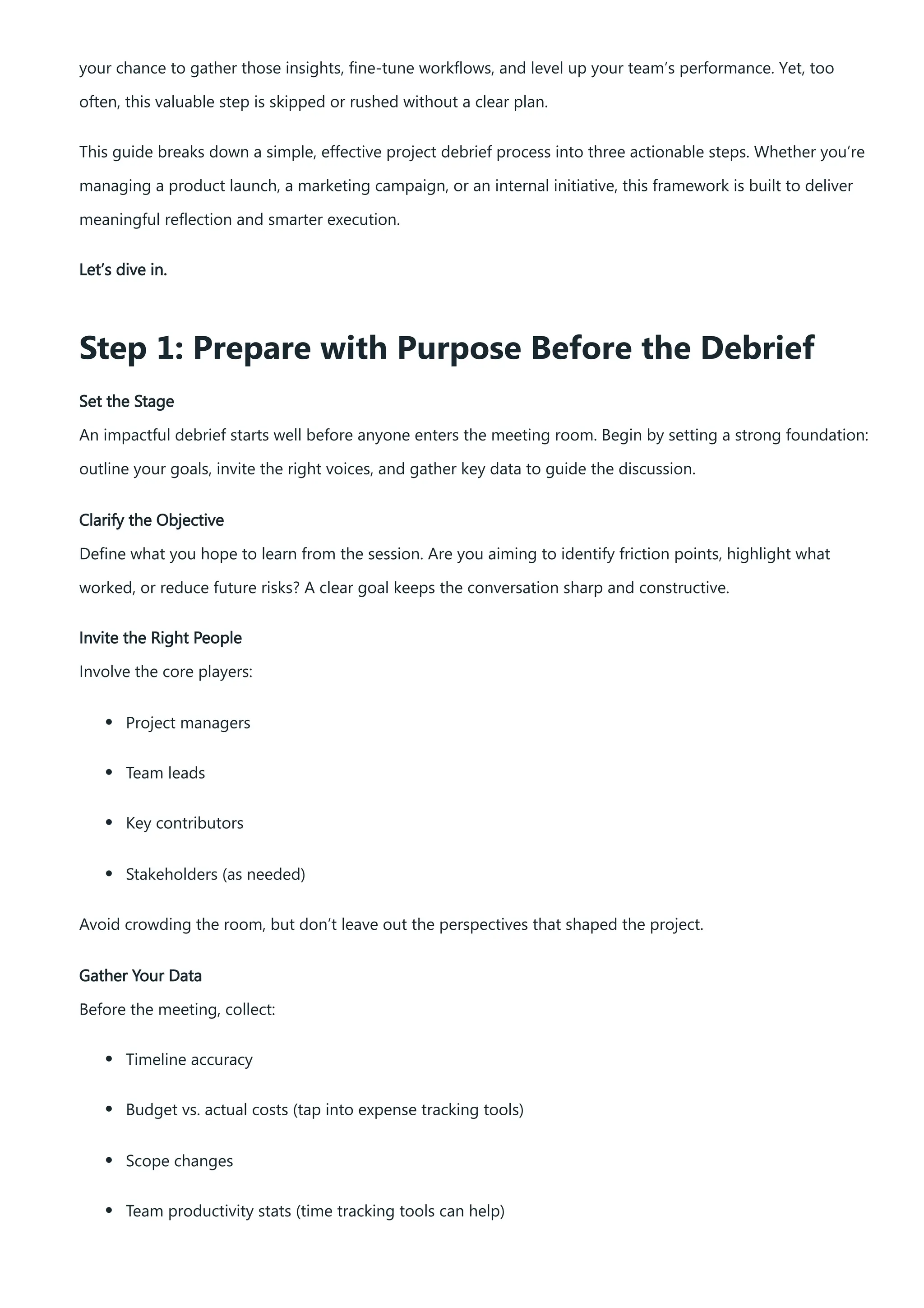 An impactful debrief starts well before anyone enters the meeting room. Begin by setting a strong foundation: