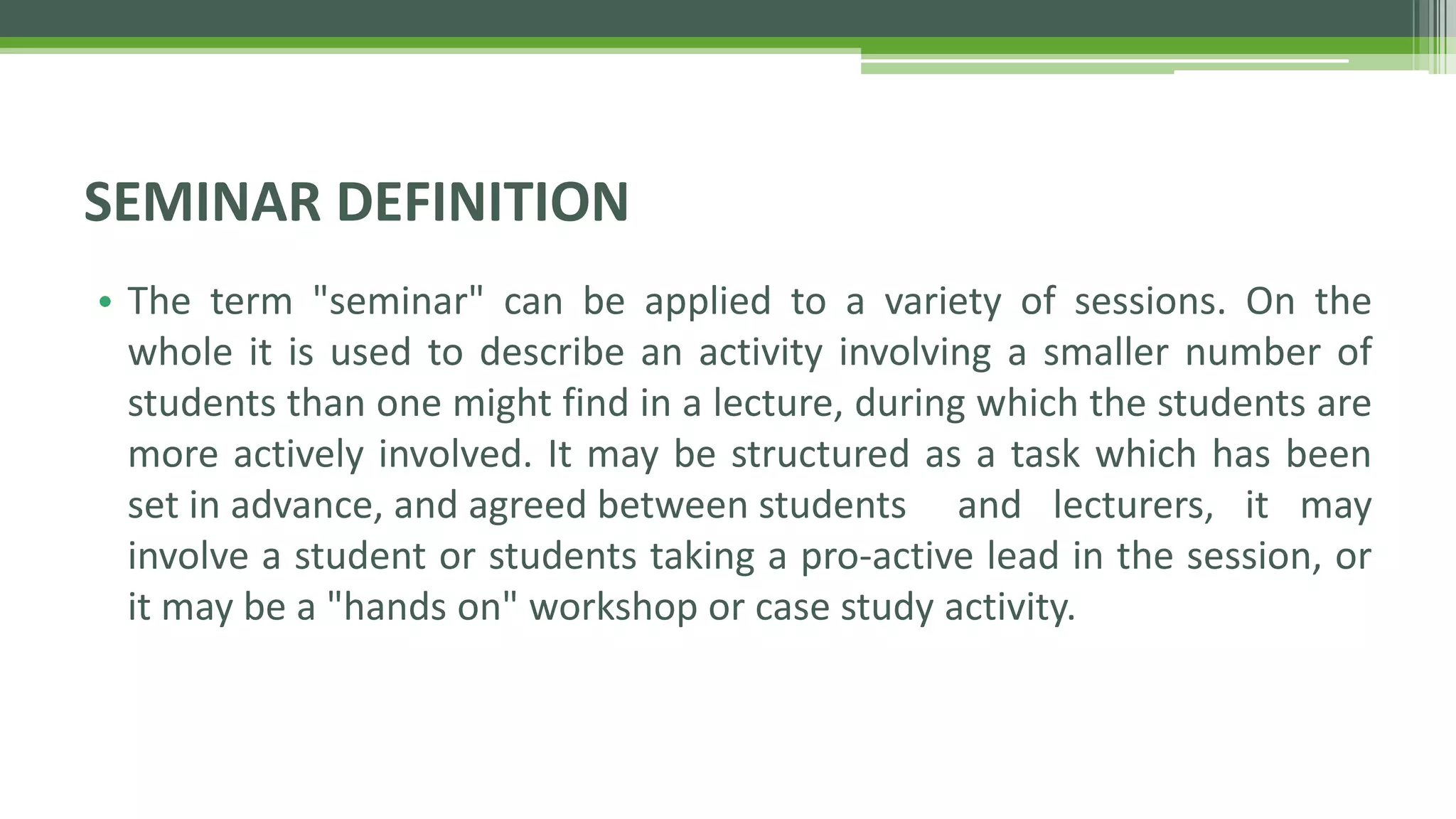 This document provides guidance on how to conduct effective seminars. It defines a seminar as an educational session involving a smaller number of students than a lecture, where students are actively involved through discussion, presentations, or hands-on activities. The purpose of seminars is to expand on material from lectures in more depth and engage students through discussion, debates, group work, and other interactive techniques. The document outlines best practices for conducting seminars, such as preparing a presentation with an introduction and conclusion, providing handouts, listening to a practice run of the presentation, outlining the seminar schedule, and using discussion techniques to promote student engagement.