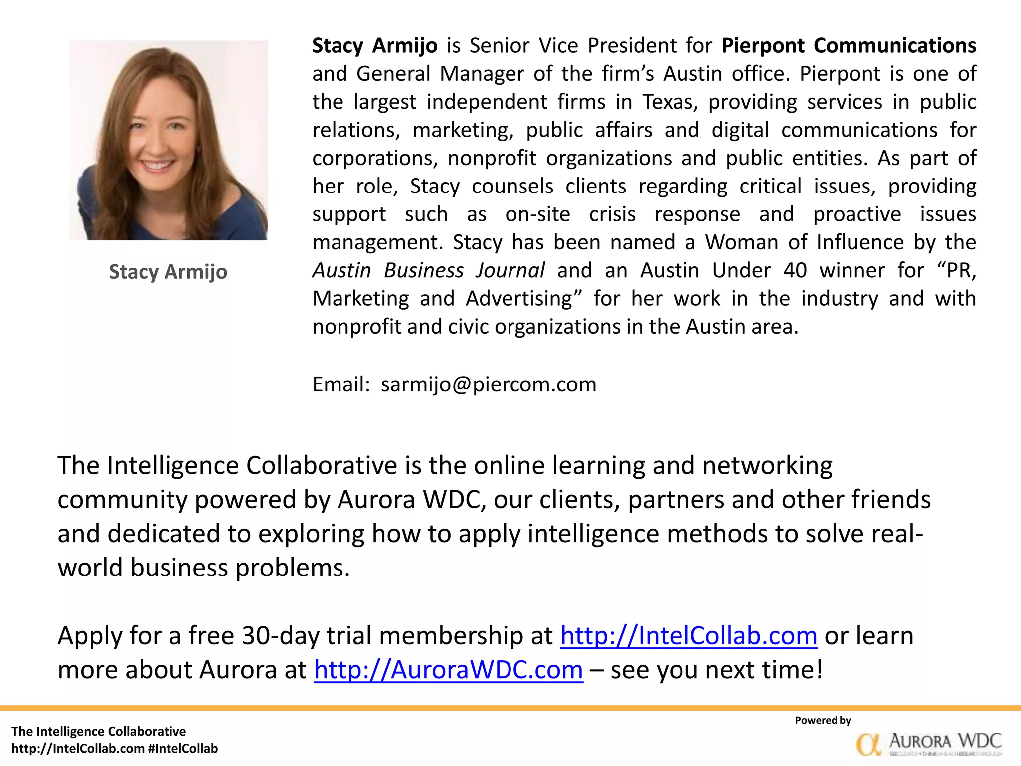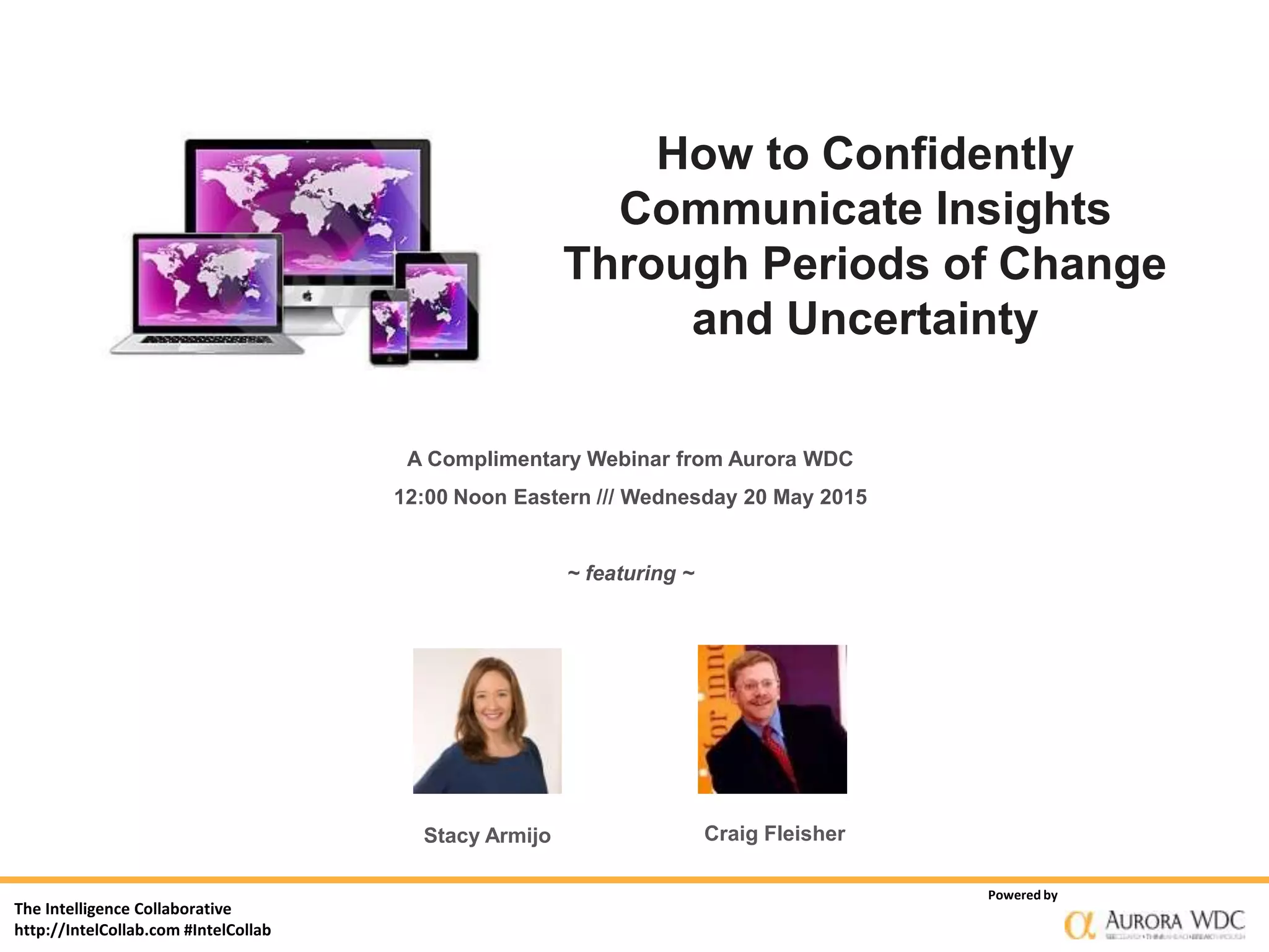 The document announces a webinar on communicating insights during periods of change and uncertainty. The webinar will feature Stacy Armijo and Craig Fleisher and cover directional considerations, in-person communications, communication styles, pitfalls to avoid, and takeaways. Attendees can ask questions during the webinar and access the slides and recording afterwards through the Intelligence Collaborative website. The webinar aims to help attendees confidently deliver insights to different audiences while navigating change.