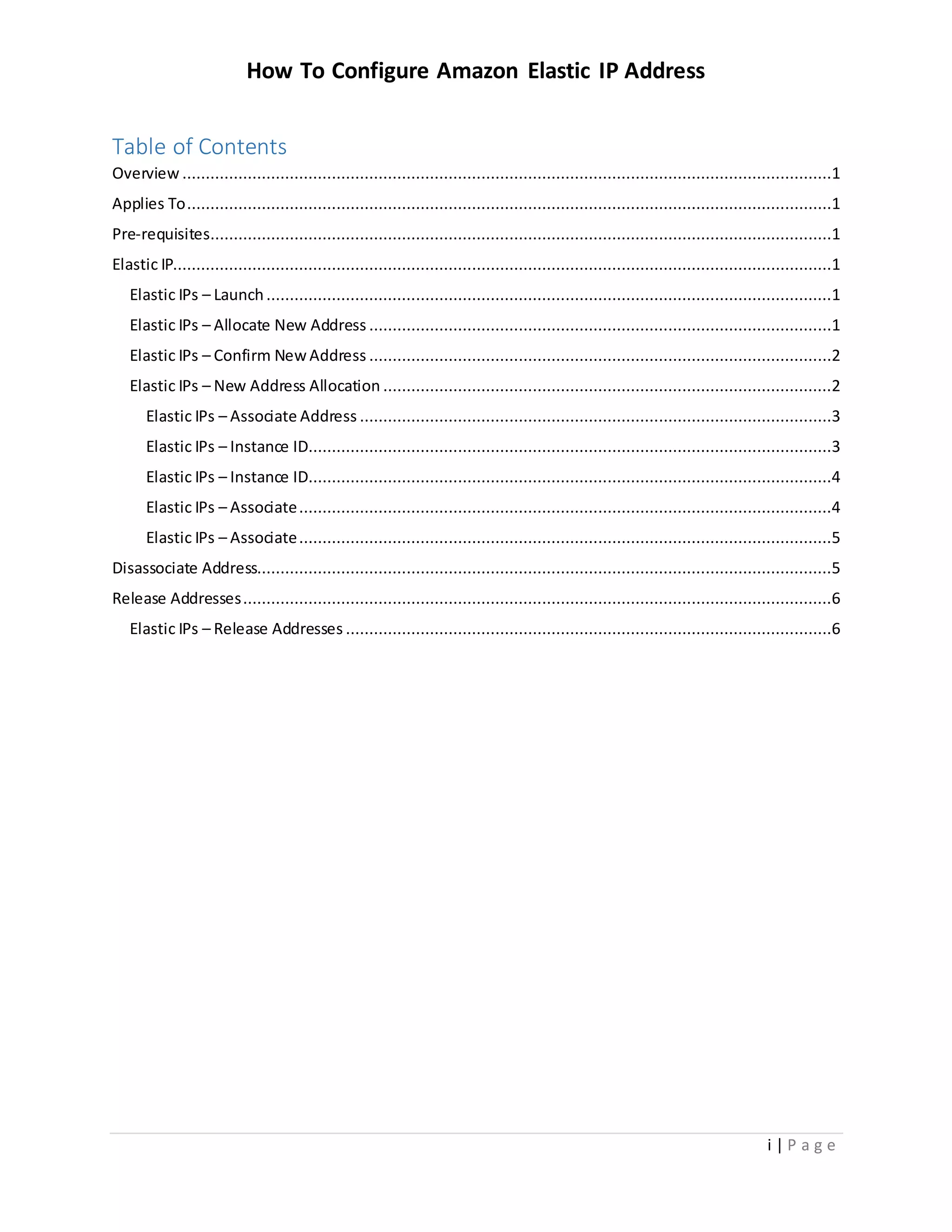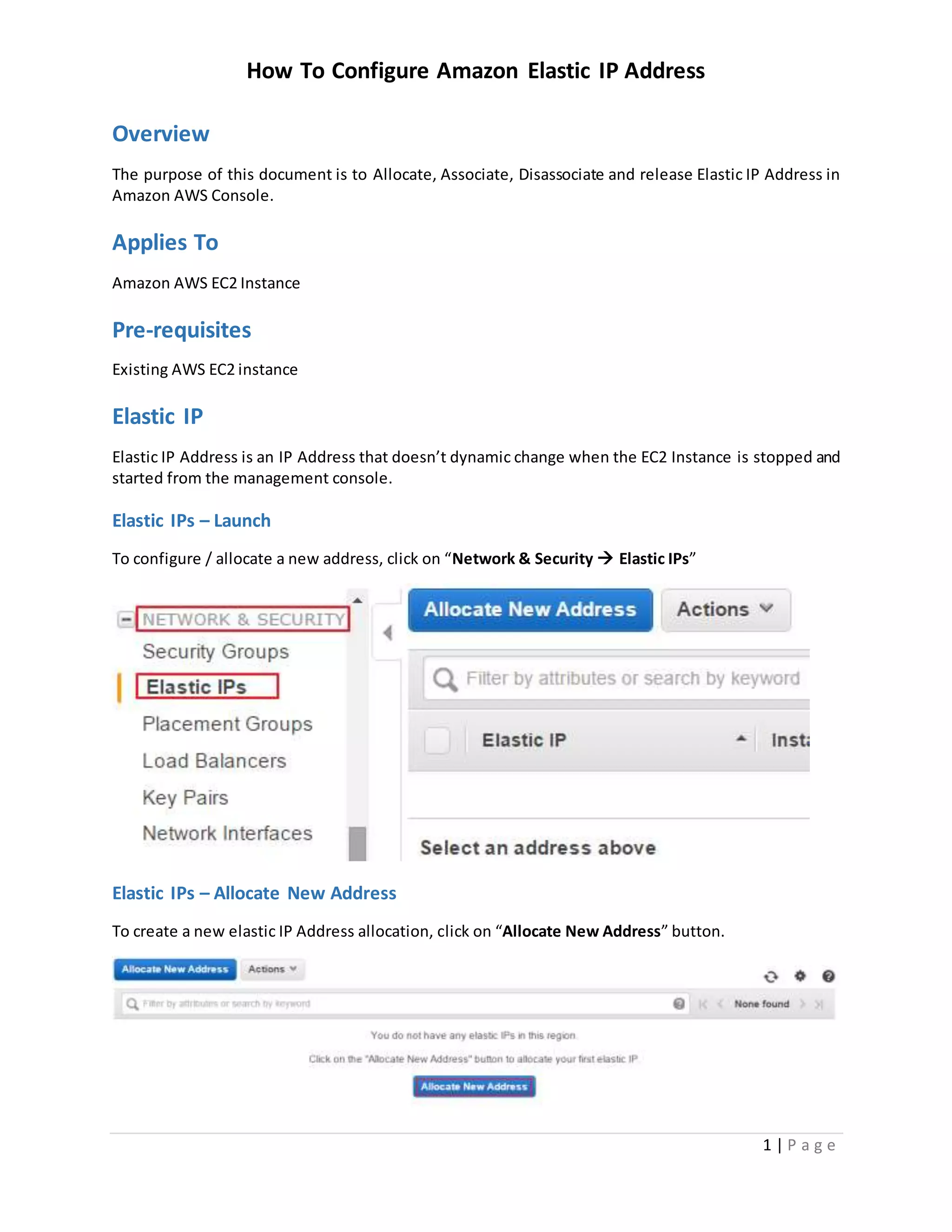 This document provides instructions for allocating, associating, disassociating, and releasing Amazon Elastic IP addresses. It explains that Elastic IPs allow keeping a static IP address even when an EC2 instance is stopped and restarted. The steps include launching the Elastic IPs section in the management console, allocating a new address, confirming allocation, associating the address to an EC2 instance, and later disassociating or releasing the address.