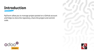 The document provides a guide on configuring and using GitHub with PyCharm Enterprise to manage projects, clone repositories, and commit code. It outlines steps to add a GitHub account in PyCharm and explains how to create a module, commit files, and push changes to GitHub. For additional resources, it directs users to the company's website and YouTube channel.