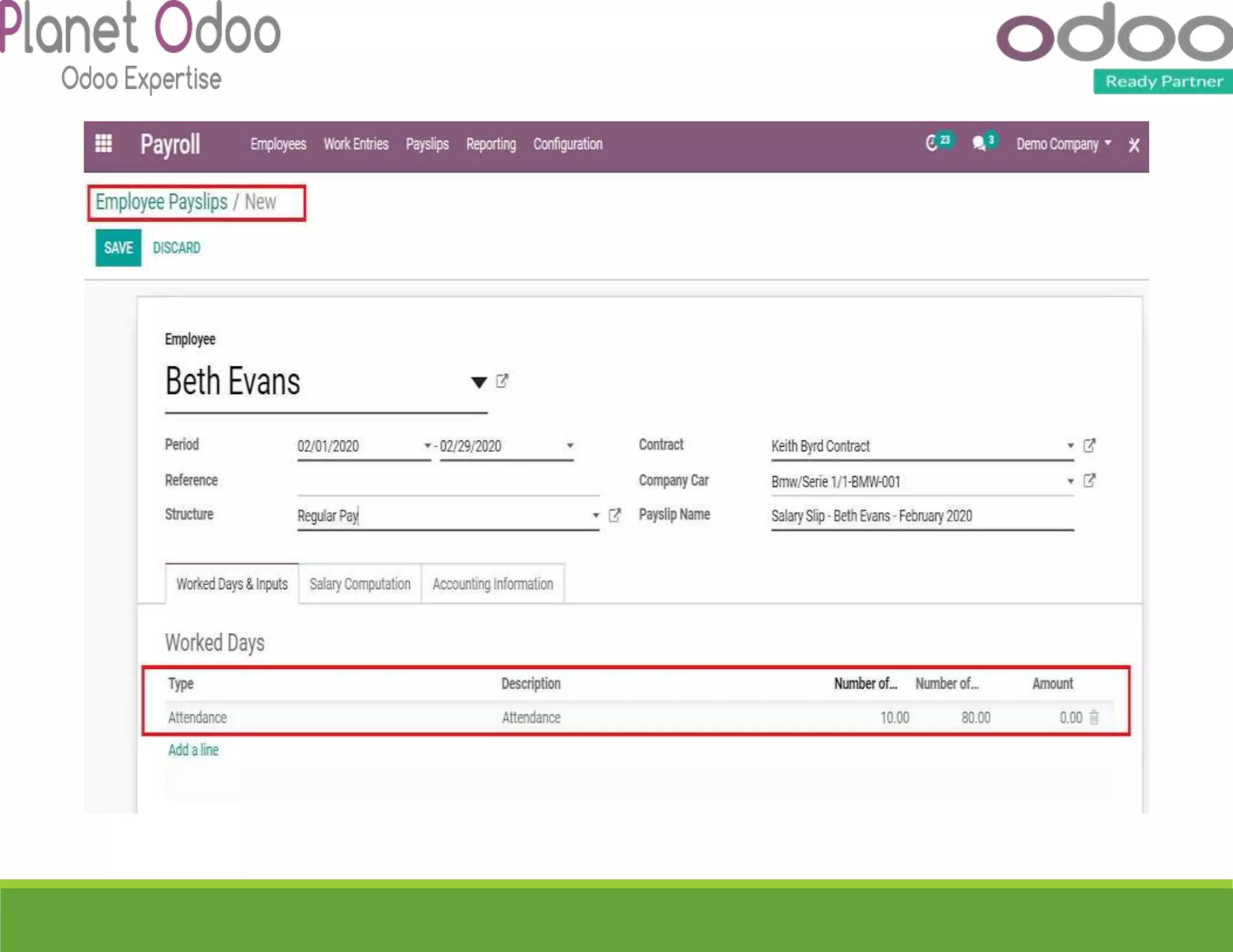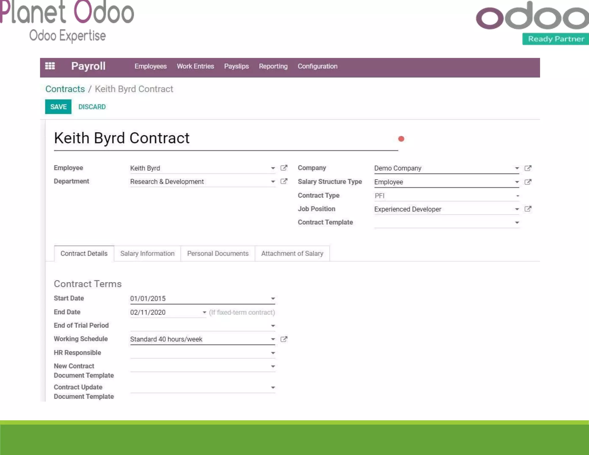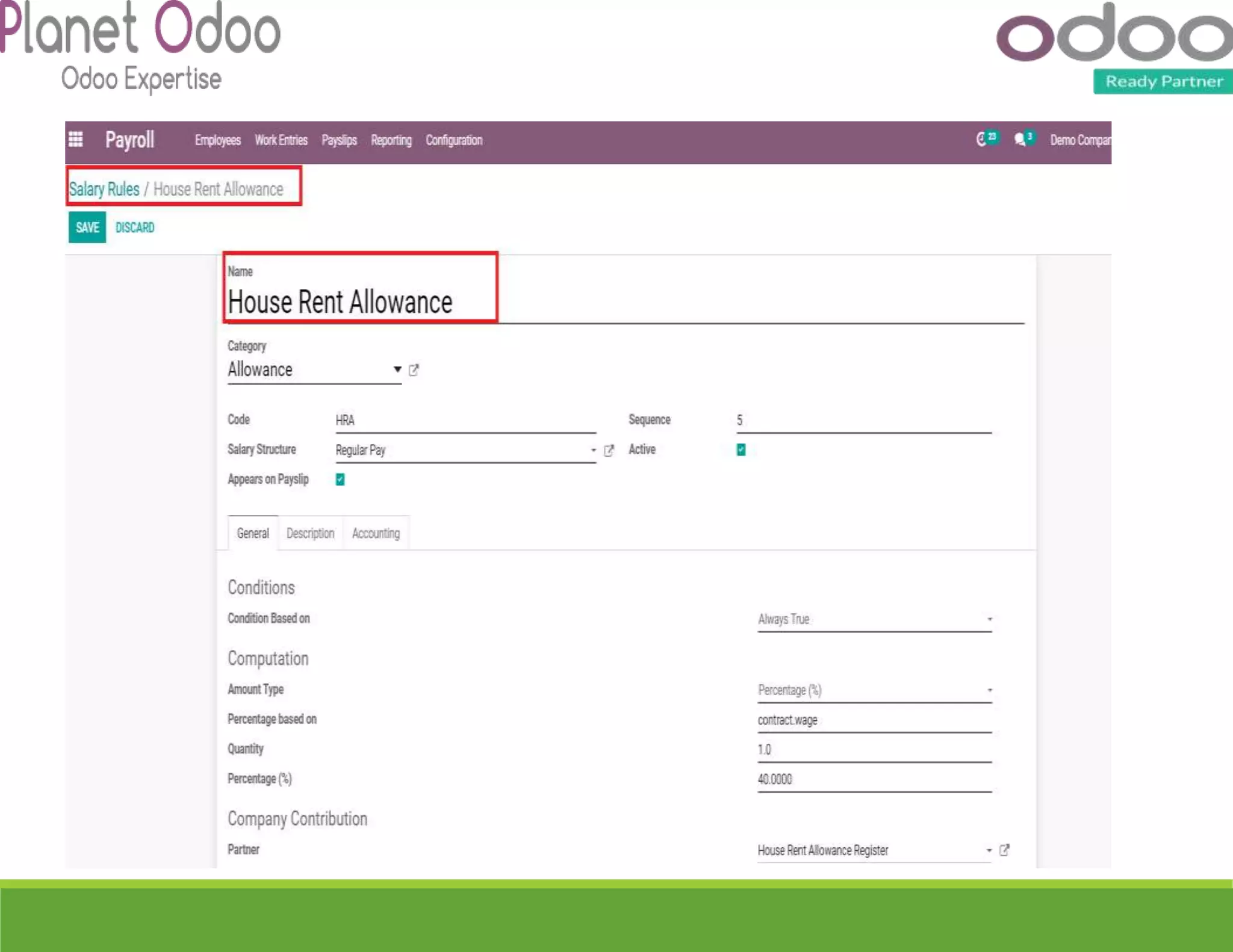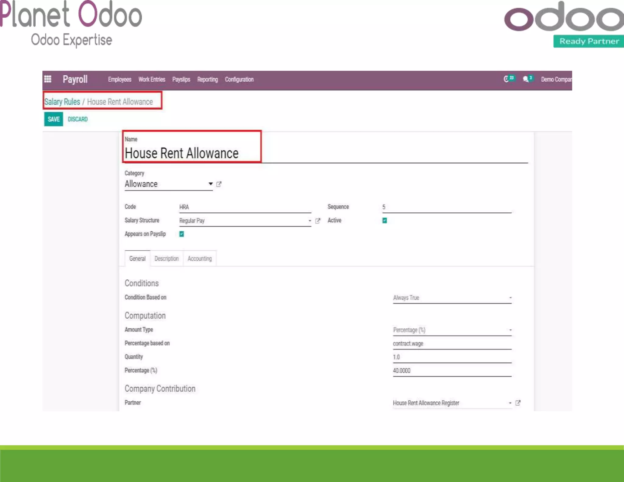 Odoo 13 payroll management facilitates the calculation of employee salaries, tax deductions, and benefits management, integrating various functions like employee details and holiday management. The system allows for defining salary rules and structures, generating pay slips, and processing payroll based on attendance. Key features include salary rule categories, employee contracts, and contribution registers that organize payroll data efficiently.