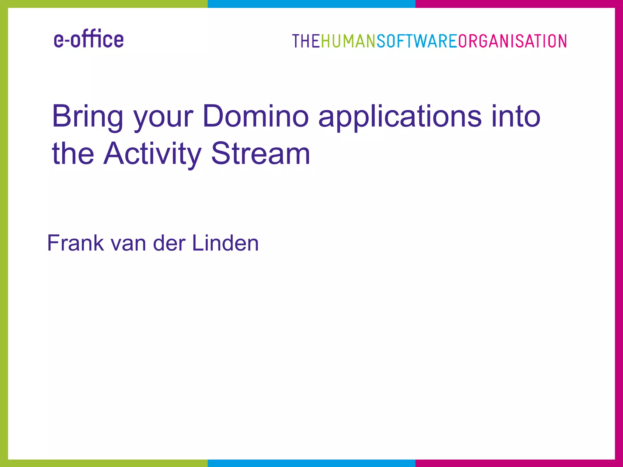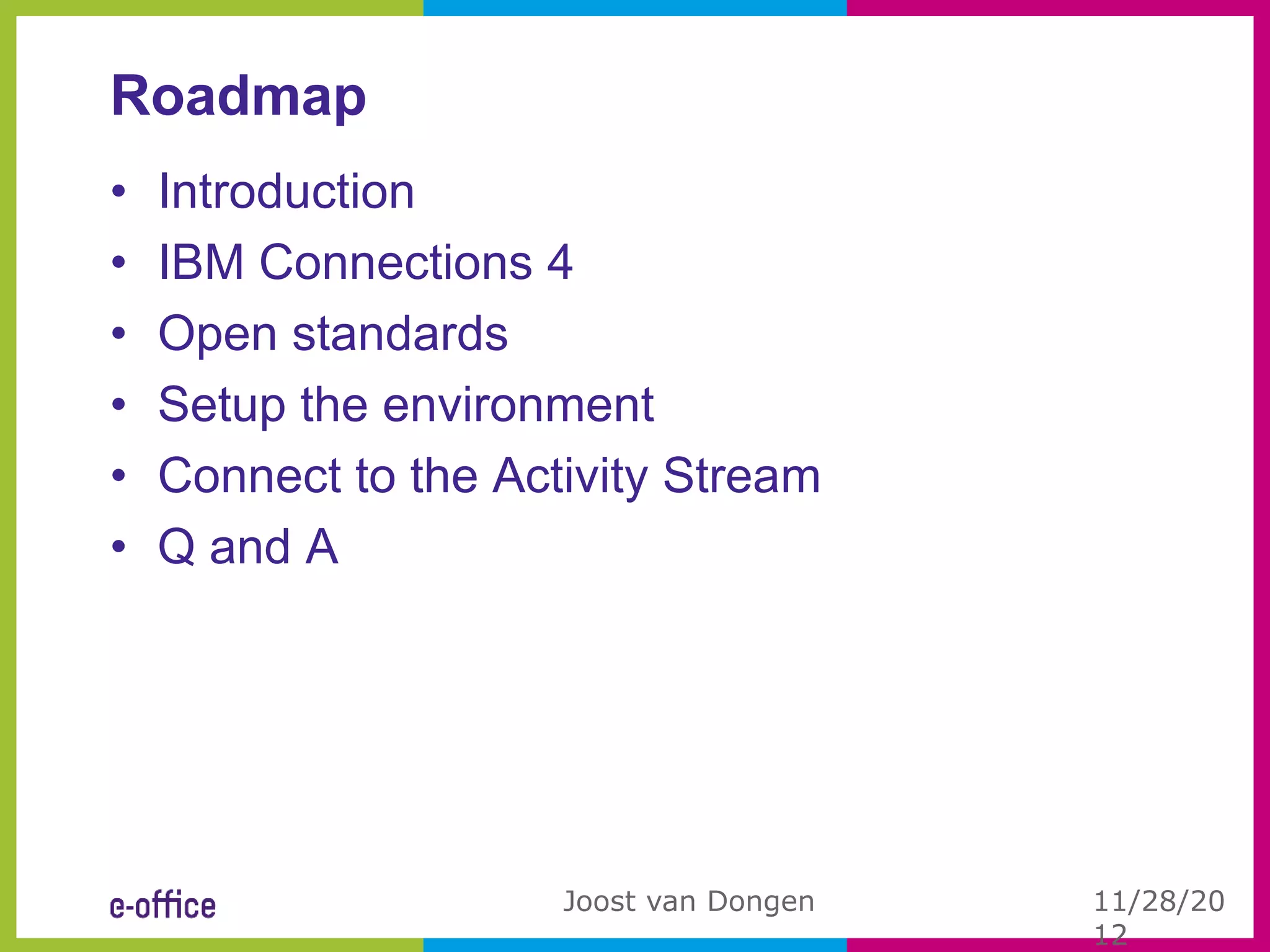 This document discusses how to connect Domino applications to the IBM Connections Activity Stream. It provides an overview of IBM Connections 4, OAuth standards, and how to set up the environment. It then describes how to connect to the Activity Stream, including registering an app, installing required databases, and retrieving and posting entries. Code samples and resources for further information are also included.