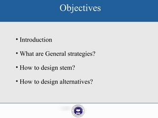 The document provides guidelines on constructing effective multiple-choice questions (MCQs), highlighting their benefits in assessment, including ease of creation and broad coverage of topics. It offers strategies for general design, creating the stem, and developing plausible alternatives, emphasizing clarity, consistency, and avoiding common pitfalls like negative wording and ambiguous choices. Well-designed MCQs should enable objective measurement of students' understanding, with only one best answer among clearly defined, mutually exclusive alternatives.