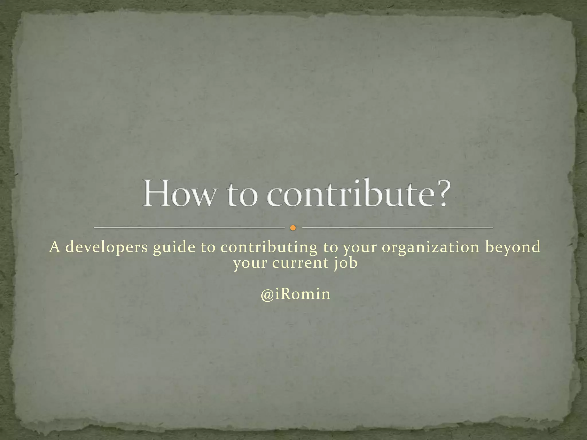 The document serves as a guide for developers looking to contribute more significantly to their organization beyond their current roles. It suggests actionable steps such as identifying technical problems, proposing solutions, addressing technical debt, and teaching teammates. The emphasis is on taking initiative, sharing knowledge, and seeking continuous improvement within projects and processes.