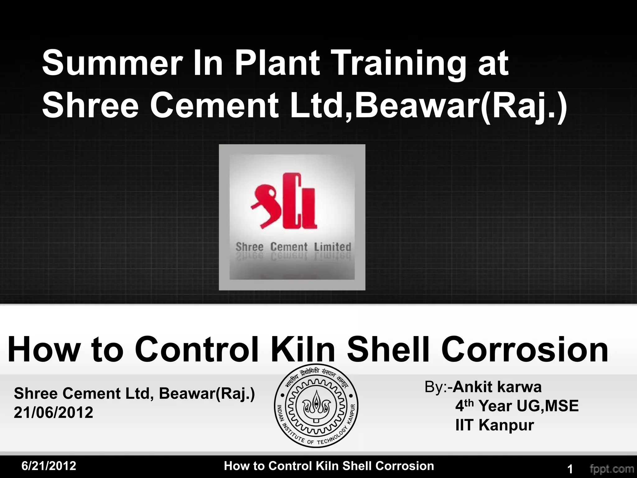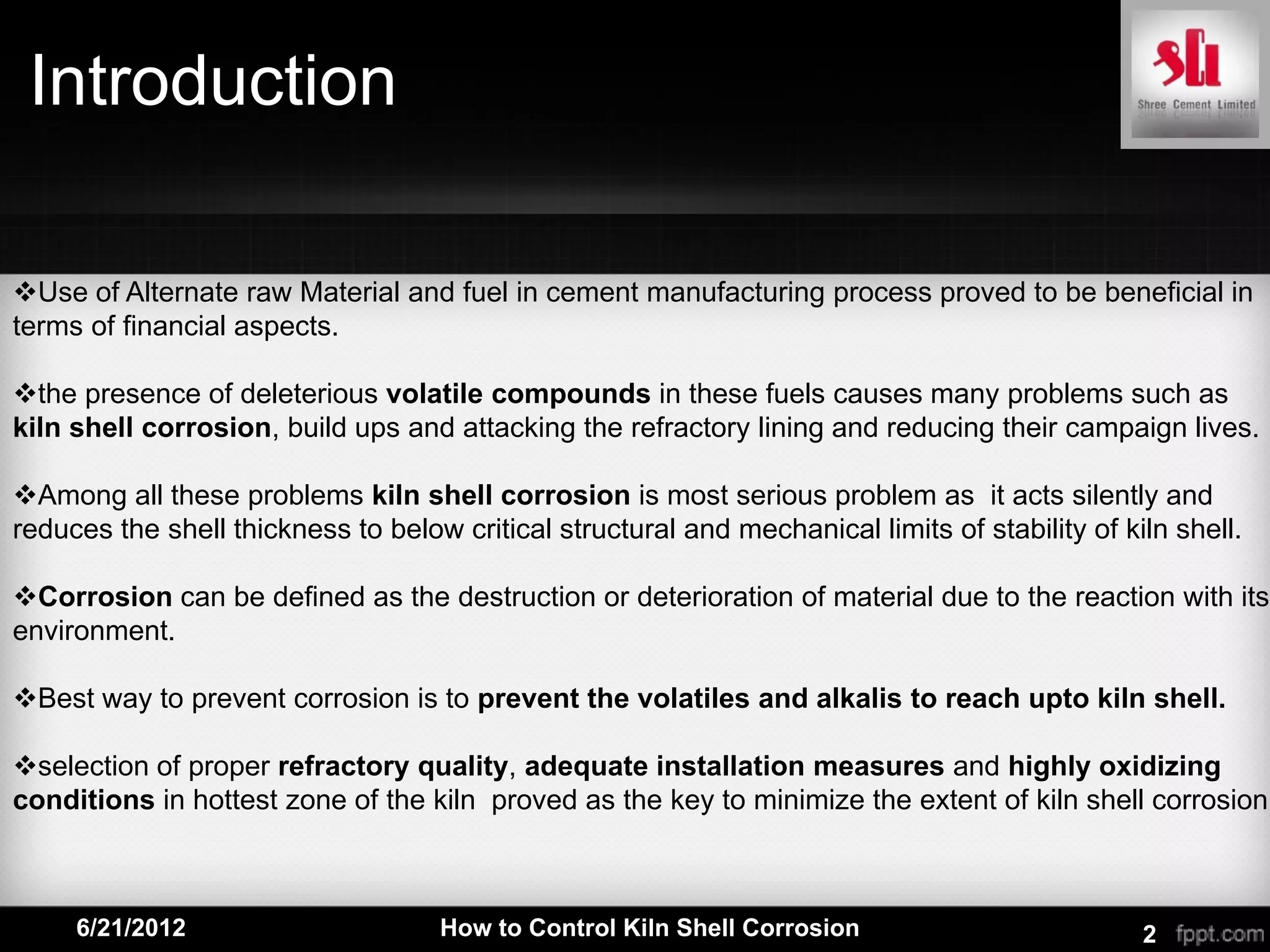 The document discusses how to control corrosion of cement kiln shells. It describes how volatile compounds from alternative fuels can cause corrosion by penetrating refractory lining and reaching the shell. Proper refractory selection, installation, and oxidizing kiln conditions can minimize corrosion. The mechanisms of oxidation and sulfidization corrosion are explained. Maintaining good refractory quality with low porosity, proper installation, and controlled process parameters can help reduce shell corrosion.
