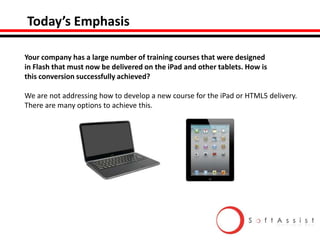 The document outlines strategies for converting Flash training courses to iPad/HTML5, emphasizing a systematic approach that utilizes an 'engine' for efficiency. It discusses the differences between native and web apps, cost considerations, and the importance of responsive design. Key lessons and instructional design issues are highlighted, along with resources and services offered by SoftAssist.