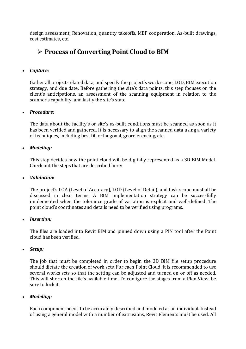 Point Cloud to BIM is proven effective and quick for using 3D models to portray an accurate digital representation after laser scanning a space or geography. Point Cloud to 3D Model can be used for many different building project processes, including construction site validation, planning for designing, verification of design, design assessment, Renovation, quantity takeoffs, MEP cooperation, As-built drawings, cost estimates, etc. For more information, read our blog https://www.chudasamaoutsourcing.com/blog/how-to-convert-point-cloud-to-3d-model/