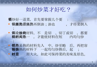 文档详细介绍了多种炒、煮、蒸、炸等烹饪技巧,包括材料的处理、火候的控制以及调味的要点,以帮助提高菜肴的美味和外观。此外,文中还提供了几道菜品的具体做法以及选材建议,使得烹饪过程更为简单和有效。通过精确的步骤和技巧指导,读者能更好地掌握厨房技能。