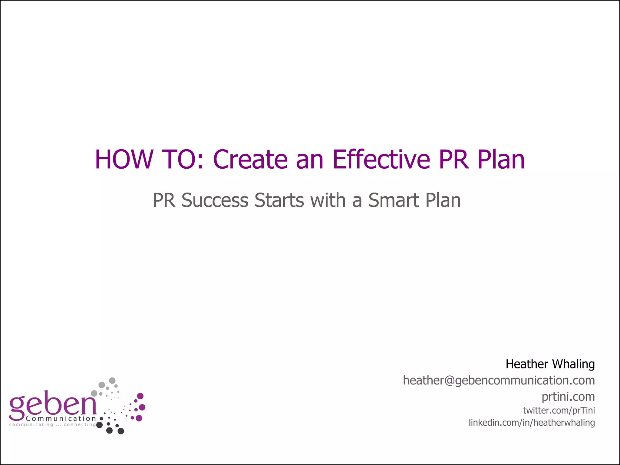 The document provides a guide on improving public relations planning, emphasizing the importance of a smart, strategic approach and timely execution. It suggests integrating online and offline communication, utilizing editorial calendars, and building relationships with reporters to enhance media and blogger relations. Key strategies include being quick, relevant, and strategic in planning and executing PR efforts over both short and long-term timelines.