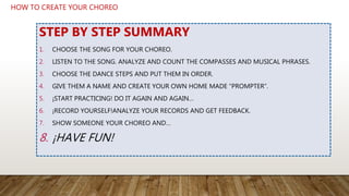 The document provides instructions for creating homemade choreography. It recommends choosing a song, listening to it to analyze the musical structure, and selecting dance steps to match the rhythm and tempo of the song. The steps should be given names and written out on a homemade prompt sheet. The choreographer practices the routine repeatedly with the help of mirrors and the prompt sheet, gradually adding more steps. Recording and sharing the finished choreography can help get feedback to improve the performance. Most importantly, the process should be enjoyable.
