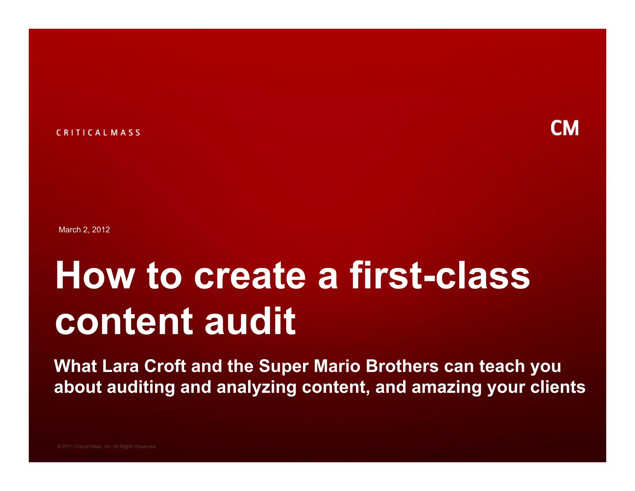 The document discusses how to conduct an effective content audit. It explains that a content audit involves both discovery of existing content and performance analysis. Discovery involves determining audit criteria and analyzing content, while performance means finding patterns, making the audit presentable and actionable. The document provides examples of content audit elements and categories to analyze. It emphasizes that an audit should go beyond a spreadsheet and provide insights to inform content strategy and priorities.