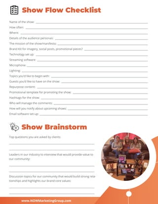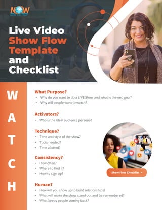 The document outlines a comprehensive live video show flow template and checklist aimed at planning and executing a successful live show. It covers key aspects such as defining the purpose, understanding the target audience, choosing the right tools, and structuring a consistent show format. Additionally, it includes a detailed weekly agenda for pre-show, live show, and post-show activities to ensure engagement and content repurposing.