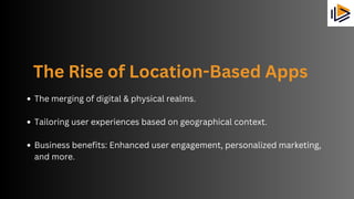 This document is a comprehensive guide on creating location-based apps, highlighting their benefits and core functionalities. It covers the ideation process, necessary technology like GPS, and emphasizes the importance of user experience and ongoing feedback. The guide concludes with steps for launching and marketing the app, underscoring the growing relevance of location-aware applications.