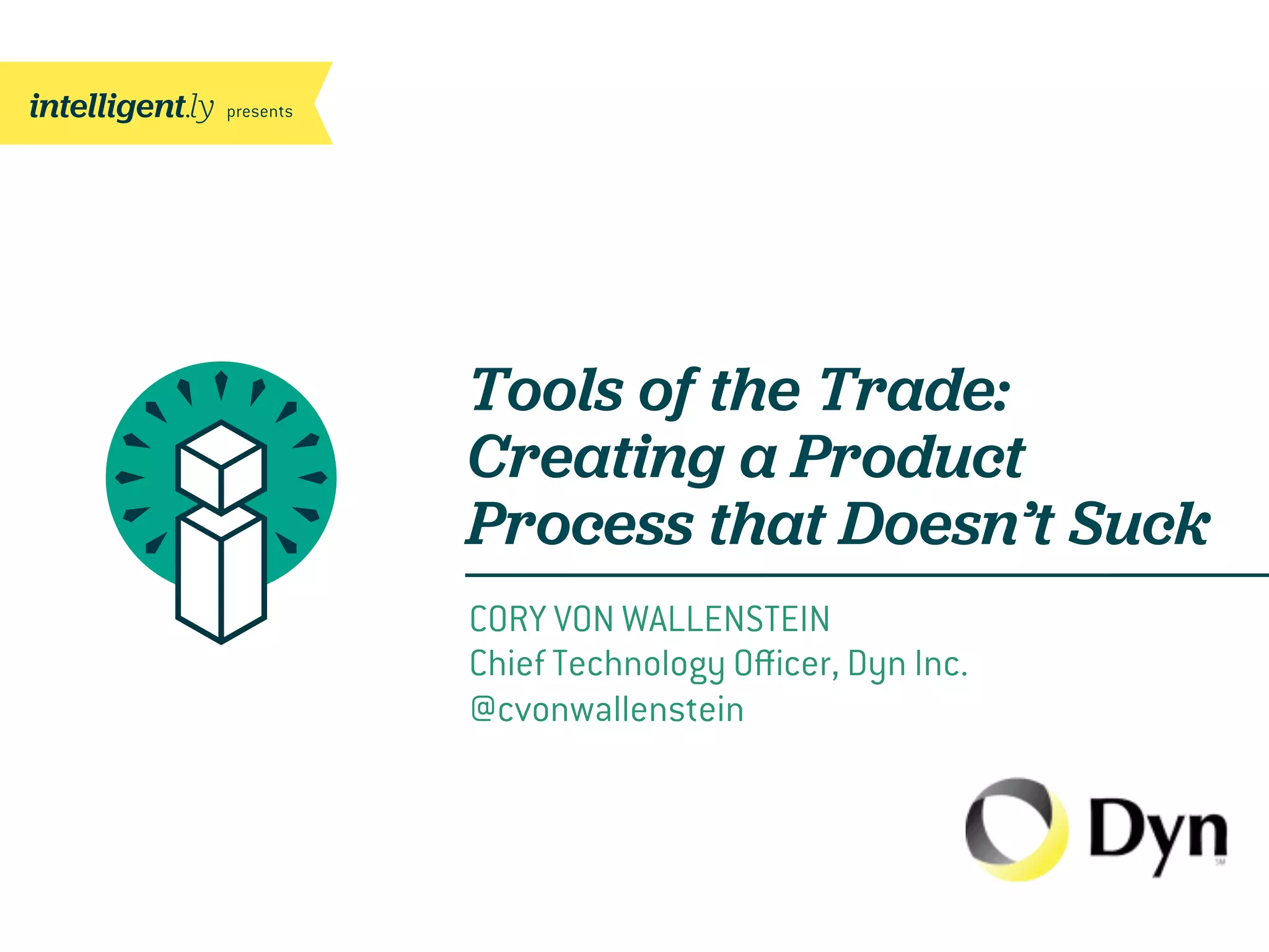 Cory von Wallenstein's presentation at Dyn Inc. outlines a product management strategy that emphasizes the importance of creating differentiated products for market success, contrasting them with 'me-too' products. It details the roles and collaborative processes of product and project management, including feature requests from various stakeholders, backlog prioritization, and the execution of sprints to deliver value. The document further explains the development workflow using Agile principles, focusing on defining tasks, assigning them, and managing releases effectively.
