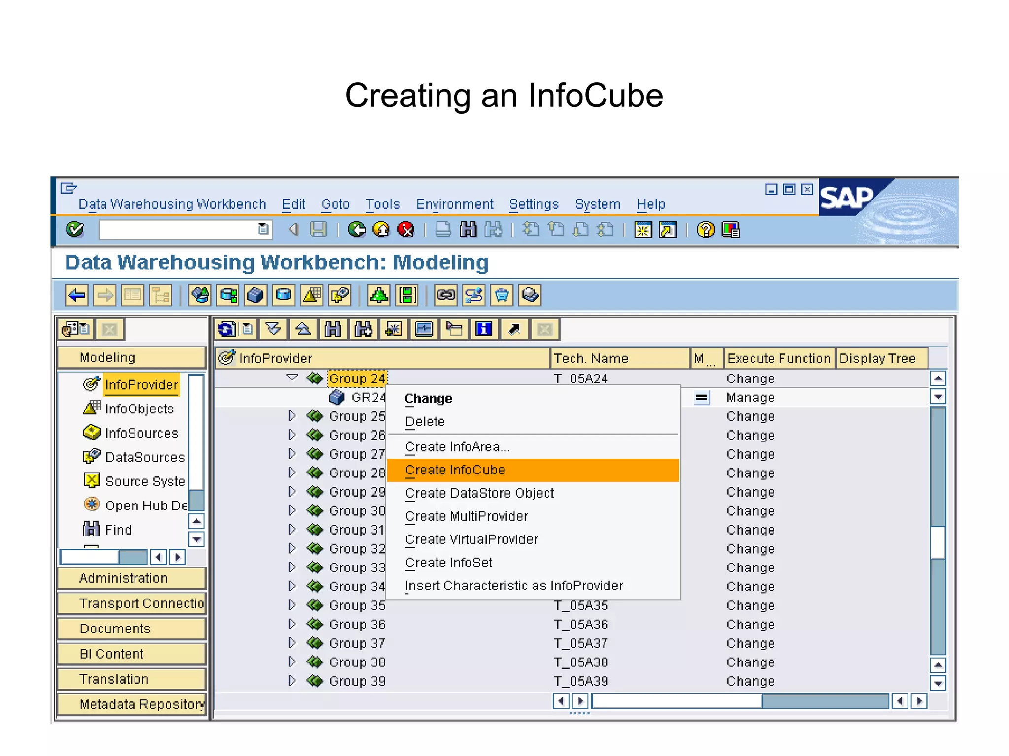 This document provides steps for creating an InfoCube in SAP BI, including editing properties, creating dimensions, adding characteristics and key figures from templates and the InfoCatalog, and adding time characteristics. It also covers checking the InfoCube, saving, and activating it. Resources for further learning include certification guides and courses on SAP BI administration, data modeling, and ABAP development.