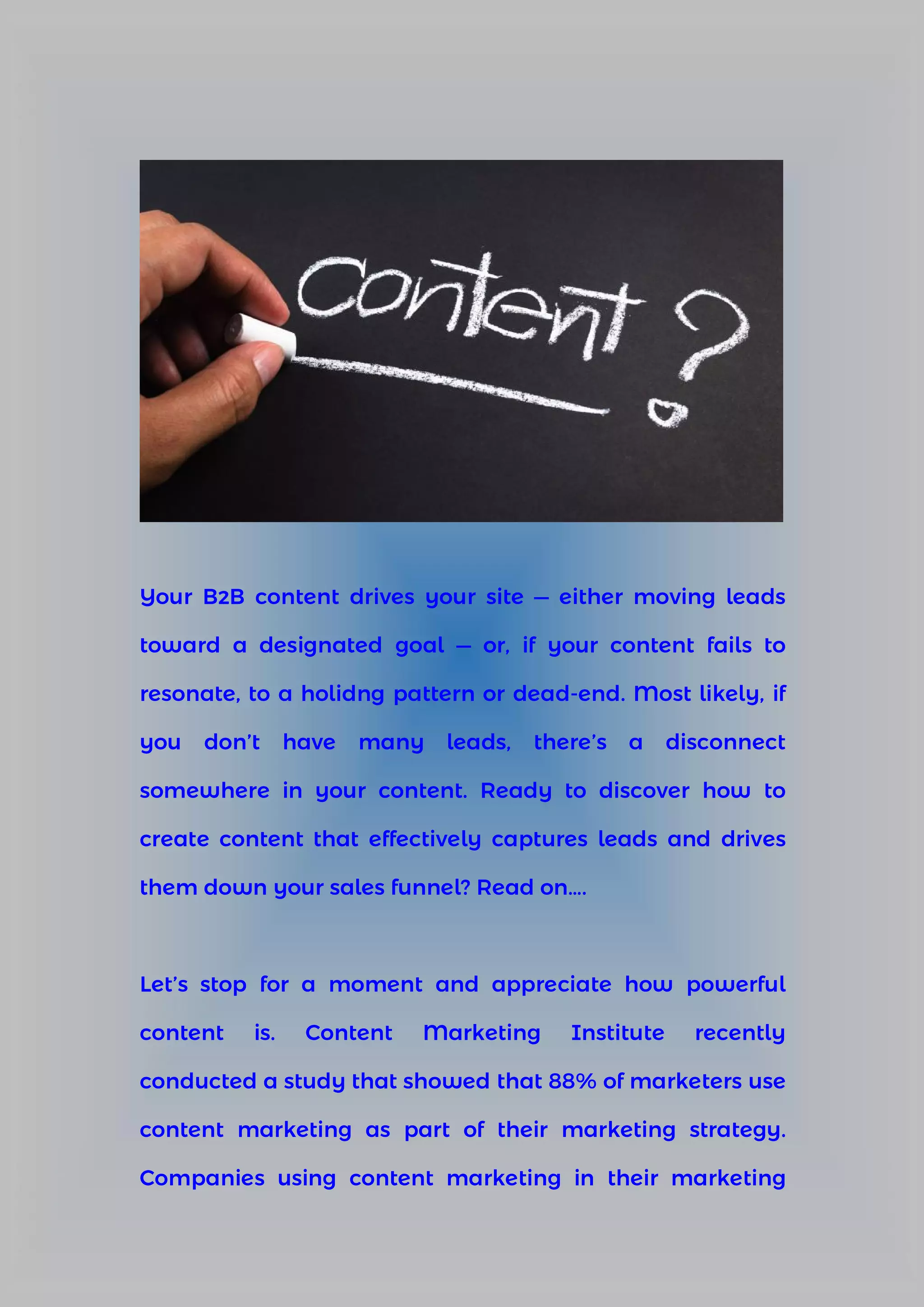 The document provides a comprehensive guide on creating effective B2B content to drive leads by understanding the target audience, crafting a solid content strategy, and utilizing storytelling and social proof. It emphasizes the importance of clear calls-to-action, building relationships with readers, and leveraging data and testimonials to establish credibility. Overall, it highlights that well-designed content marketing can significantly improve conversion rates and lead generation.