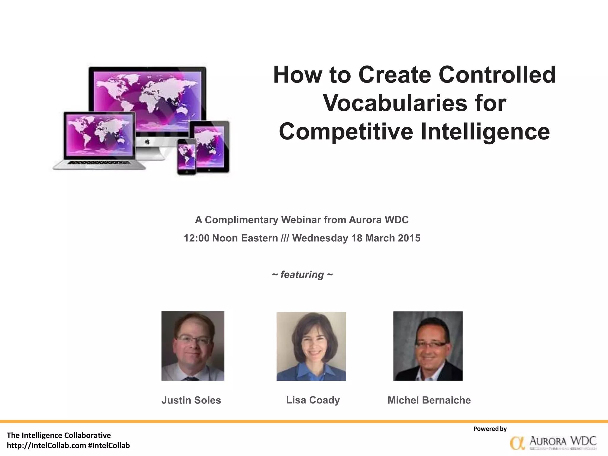 The document describes an upcoming webinar on creating controlled vocabularies for competitive intelligence. The webinar will feature two speakers, Justin Soles and Lisa Coady, and will cover topics such as what a controlled vocabulary is, how it can help competitive intelligence work, and best practices for developing one. Attendees are encouraged to ask questions during the webinar.