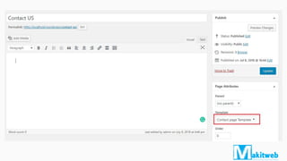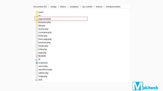The document outlines how to create a custom page template in WordPress to design unique layouts and content for specific pages without affecting others. It includes steps for creating a template file, applying the template to a page in the admin dashboard, and provides code examples for a contact form. Using custom templates is recommended for specific page customizations.