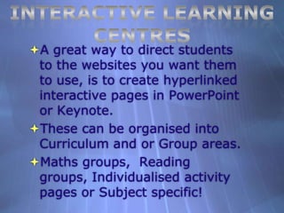 This document provides instructions for creating interactive learning centers in PowerPoint by hyperlinking screenshots of websites to curriculum topics. Teachers can organize subjects into groups and take screenshots of relevant websites to include and hyperlink in PowerPoint slides. These slides can then be saved as a PowerPoint file for later editing and also as a PowerPoint show so that students can interactively access the linked web resources from the presentation in slideshow view.