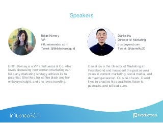 Speakers Brittni Kinney VP influenceandco.com Tweet: @bkblackandgold BrittniKinney is a VP at Influence & Co. who loves discussing how content marketing can help any marketing strategy achieve its full potential. She likes her coffee black and her whiskey straight, and she loves traveling. Daniel Ku is the Director of Marketing at PostBeyond and has spent the past several years in content marketing, social media, and demand generation. Outside of work, Daniel likes to practice his squat form, listen to podcasts, and tell bad puns. Daniel Ku Director of Marketing postbeyond.com Tweet: @danielku20
