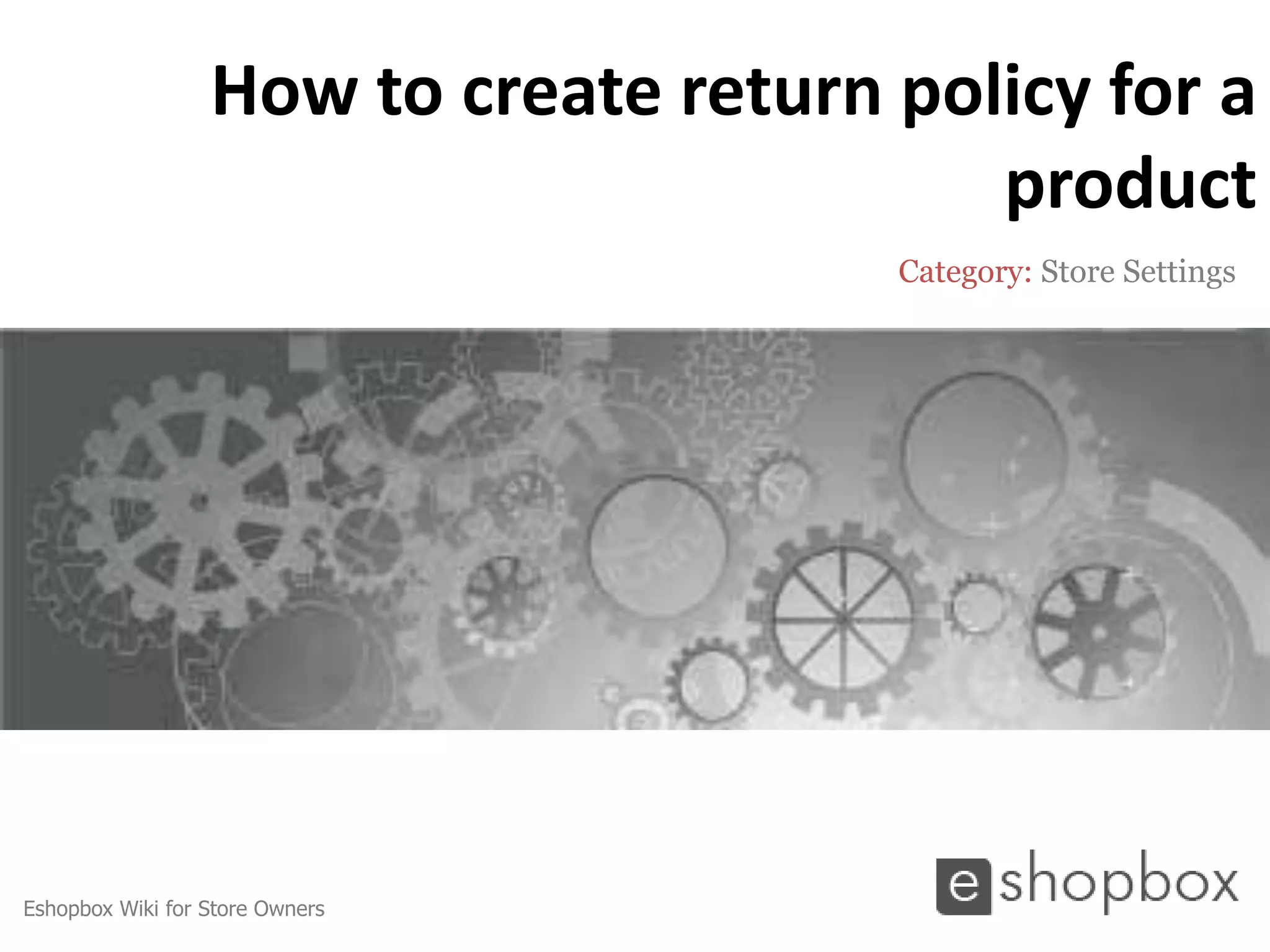 This document discusses how to create a return policy for products on an ecommerce store. It outlines a 15 step process for store owners to define terms and conditions for returns, including specifying return periods, restocking fees, refund policies, and more. The thorough return policy helps protect buyers and sellers by clarifying expectations for item issues like defective products or incorrect items.