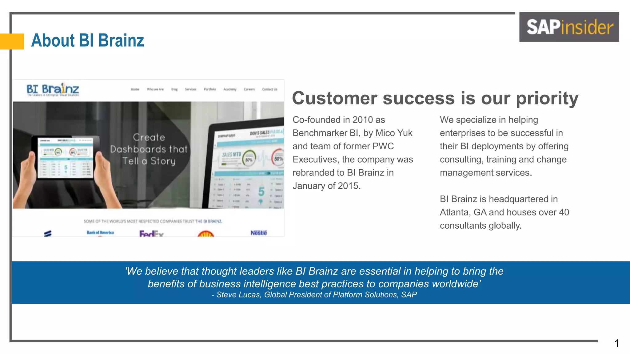 The document discusses the importance of Key Performance Indicators (KPIs) in business intelligence, highlighting a $76 billion problem related to ineffective BI deployments. It outlines characteristics of effective KPIs and emphasizes the need for actionable metrics to enhance data visualization and organizational success. Additionally, resources for KPI management and training services offered by BI Brainz are mentioned.