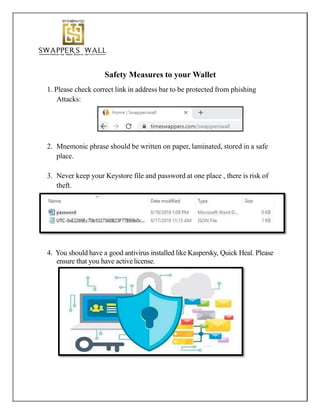 The document provides a comprehensive guide on safety measures for cryptocurrency wallets, emphasizing the importance of avoiding phishing attacks, securely storing mnemonics, and using strong passwords. It outlines steps to create a wallet, log in, update profiles, and manage posts on Swapper Wall. It also details how to handle different access methods, including keystore files and mnemonic phrases for wallet access.