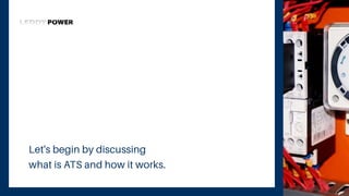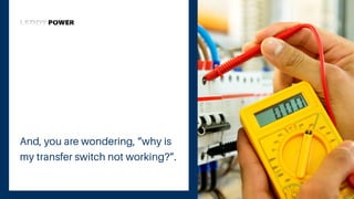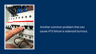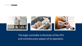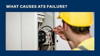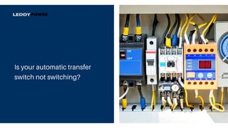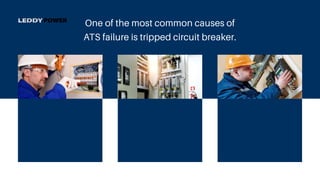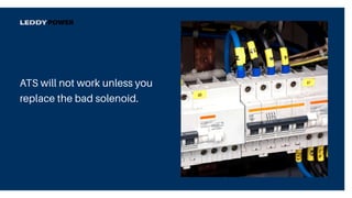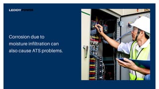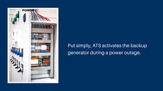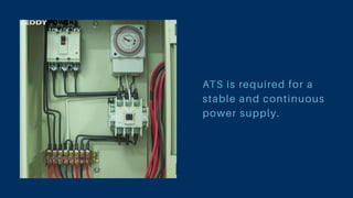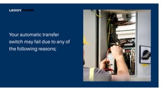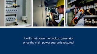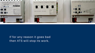 The document describes an automatic power switching apparatus that relies on a transfer logic controller and power source. It warns that the power backup system can fail if the transfer switch is damaged and suggests environmental protection to prevent such issues. It encourages testing the automatic transfer switch if problems arise, providing contact information for assistance.