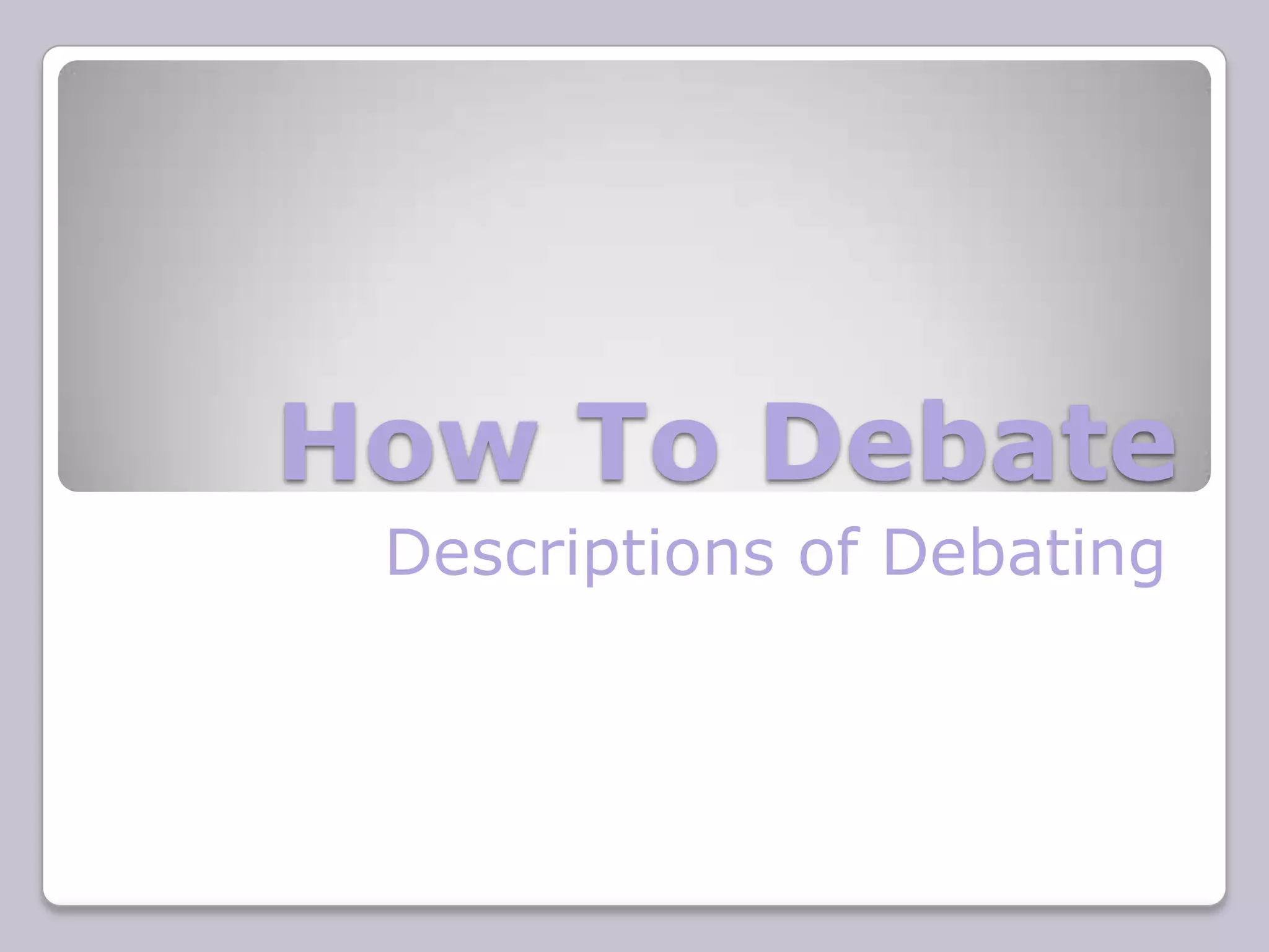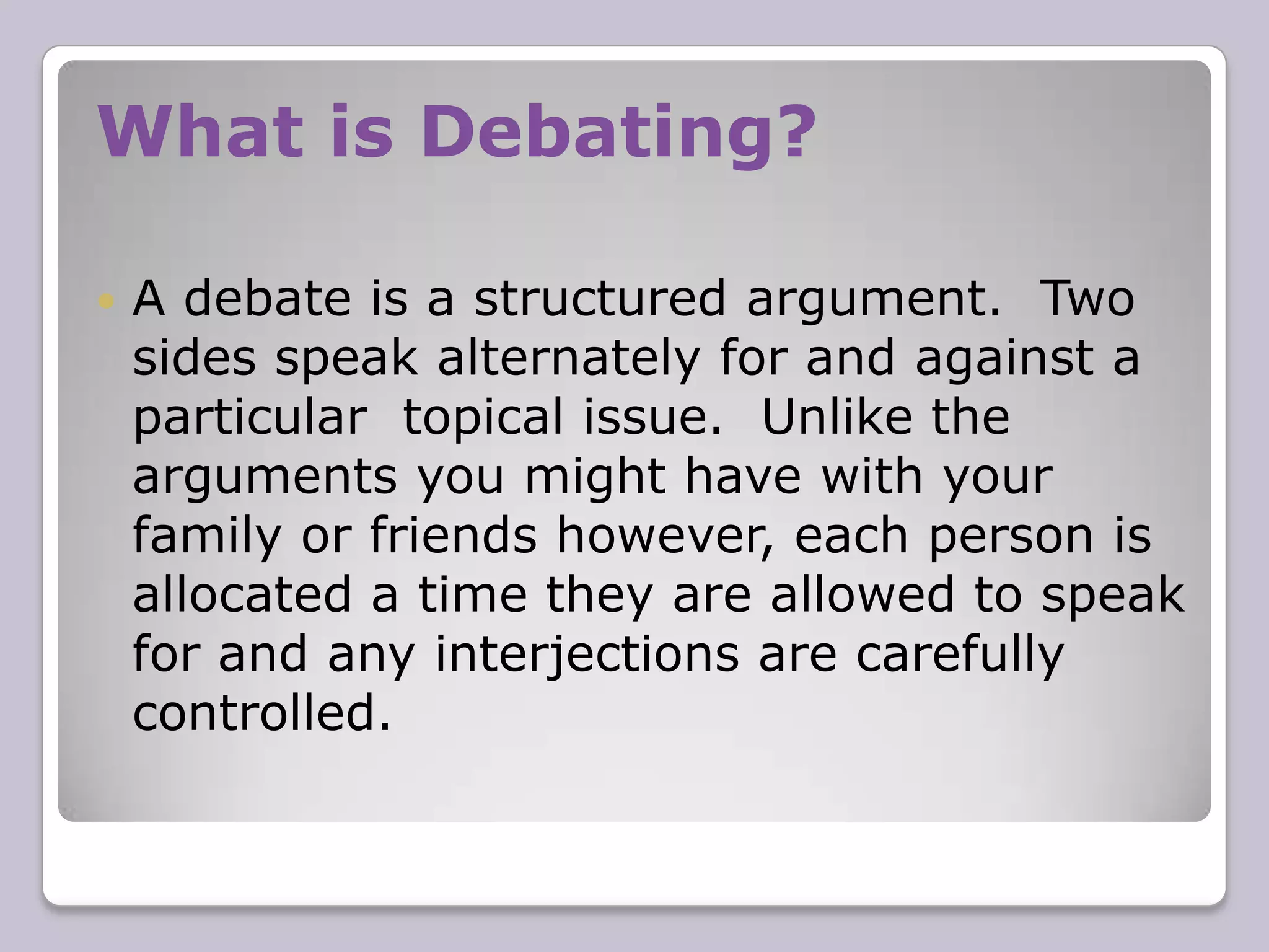 This document provides instructions on how to debate effectively. It discusses what a debate is, why people debate, and basic debating skills. The skills covered include style, speed, tone, volume, clarity, use of notes, eye contact, content, case structure, and rebuttal techniques. The document emphasizes the importance of presenting arguments in a clear, logical, and evidence-based manner while also engaging with the audience. Debates involve structuring an argument, supporting various positions, and systematically addressing opposing views.