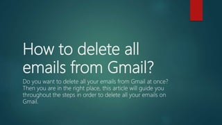 This document provides steps to delete all emails from a Gmail account at once. It instructs the user to log in to their Gmail account and select the "All mail" option from the left pane. Then the user should select the checkbox at the top left and select "All conversations in Primary" to select all emails. Finally, the user clicks the bin icon to delete all emails and confirms the deletion. The emails will be moved to the trash and the user must select "Empty Trash now" to permanently delete all emails.