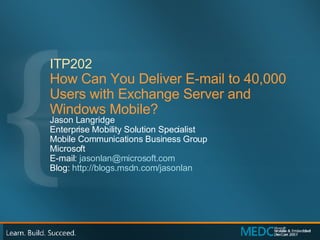 This document summarizes a presentation about deploying mobile devices at large scale using Microsoft Exchange Server and Windows Mobile. The presentation covers infrastructure requirements, procurement considerations, provisioning tools, device management, support needs, and lessons learned from Microsoft's internal deployment of over 40,000 mobile devices. Effective planning of infrastructure, standardized device selection, centralized management capabilities, and end-user support are key to a successful large-scale mobile rollout.